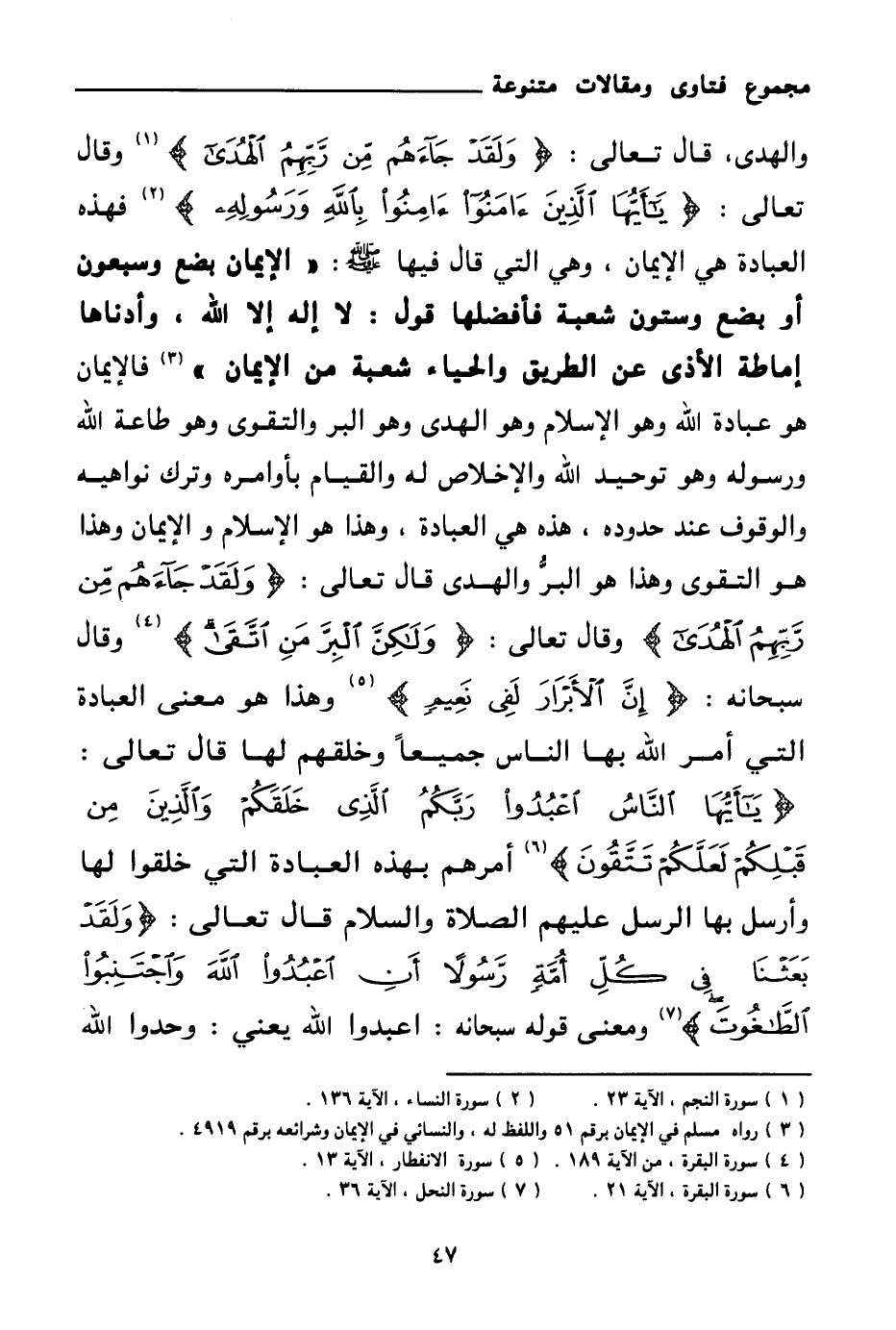فهذه العبادة هي الإيمان، وهي التي قال فيها صلى الله عليه وسلم: «الإيمان بضع وسبعون أو بضع وستون شعبة فأفضلها قول: لا إله إلا الله، وأدناها إماطة الأذى عن الطريق، والحياء شعبة من الإيمان (¬3) » فالإيمان هو عبادة الله وهو الإسلام وهو الهدى وهو البر والتقوى وهو طاعة الله ورسوله وهو توحيد الله والإخلاص له والقيام بأوامره وترك نواهيه والوقوف عند حدوده، هذه هي العبادة، وهذا هو الإسلام والإيمان وهذا هو التقوى وهذا هو البر والهدى قال تعالى: {وَلَقَدْ جَاءَهُمْ مِنْ رَبِّهِمُ الْهُدَى} (¬4) وقال تعالى: {وَلَكِنَّ الْبِرَّ مَنِ اتَّقَى} (¬5) وقال سبحانه: {إِنَّ الْأَبْرَارَ لَفِي نَعِيمٍ} (¬6)