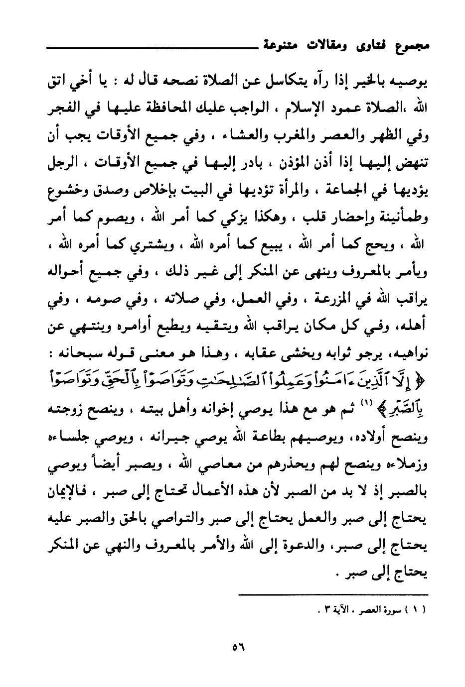 يوصيه بالخير إذا رآه يتكاسل عن الصلاة نصحه قال له: يا أخي اتق الله، الصلاة عمود الإسلام، والواجب عليك المحافظة عليها في الفجر وفي الظهر والعصر والمغرب والعشاء، وفي جميع الأوقات يجب أن تنهض إليها إذا أذن المؤذن، بادر إليها في جميع الأوقات، الرجل يؤديها في الجماعة، والمرأة تؤديها في البيت بإخلاص وصدق وخشوع وطمأنينة وإحضار قلب، وهكذا يزكي كما أمر الله، ويصوم كما أمر الله، ويحج كما أمر الله، يبيع كما أمره الله، ويشتري كما أمره الله، ويأمر بالمعروف وينهى عن المنكر إلى غير ذلك، وفي جميع أحواله يراقب الله في المزرعة، وفي العمل، وفي صلاته، وفي صومه، وفي أهله، وفي كل مكان يراقب الله ويتقيه ويطيع أوامره وينتهي عن نواهيه، يرجو ثوابه ويخشى عقابه، وهذا هو معنى قوله سبحانه: {إِلَّا الَّذِينَ آمَنُوا وَعَمِلُوا الصَّالِحَاتِ وَتَوَاصَوْا بِالْحَقِّ وَتَوَاصَوْا بِالصَّبْرِ} (¬1)