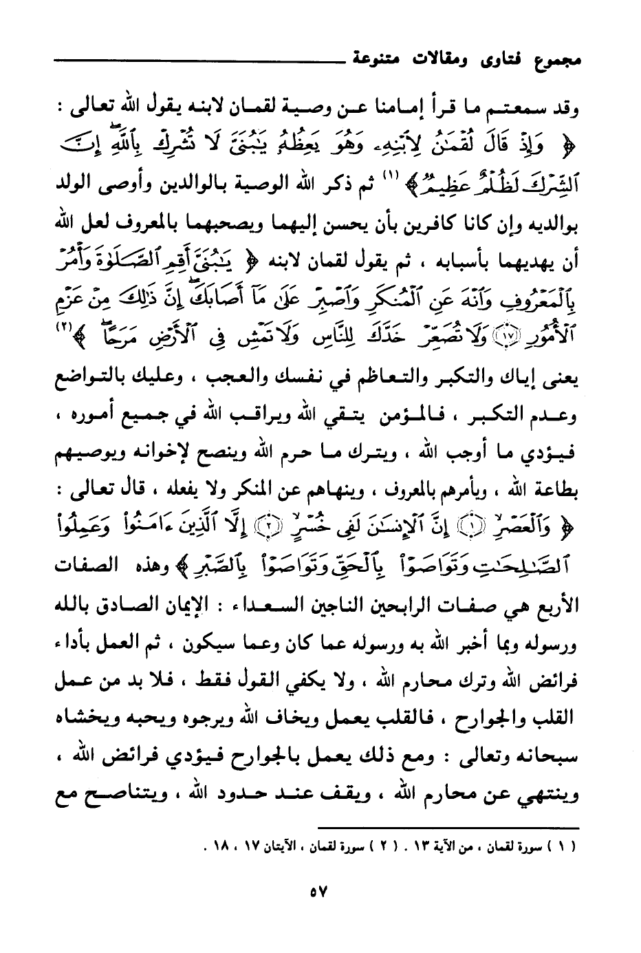 وقد سمعتم ما قرأ إمامنا عن وصية لقمان لابنه يقول الله تعالى: {وَإِذْ قَالَ لُقْمَانُ لِابْنِهِ وَهُوَ يَعِظُهُ يَا بُنَيَّ لَا تُشْرِكْ بِاللَّهِ إِنَّ الشِّرْكَ لَظُلْمٌ عَظِيمٌ} (¬1) ثم ذكر الله الوصية بالوالدين وأوصى الولد بوالديه وإن كانا كافرين بأن يحسن إليهما ويصحبهما بالمعروف لعل الله أن يهديهما بأسبابه، ثم يقول لقمان لابنه {يَا بُنَيَّ أَقِمِ الصَّلَاةَ وَأْمُرْ بِالْمَعْرُوفِ وَانْهَ عَنِ الْمُنْكَرِ وَاصْبِرْ عَلَى مَا أَصَابَكَ إِنَّ ذَلِكَ مِنْ عَزْمِ الْأُمُورِ} (¬2) {وَلَا تُصَعِّرْ خَدَّكَ لِلنَّاسِ وَلَا تَمْشِ فِي الْأَرْضِ مَرَحًا} (¬3) يعنى إياك والتكبر والتعاظم في نفسك والعجب، وعليك بالتواضع وعدم التكبر.