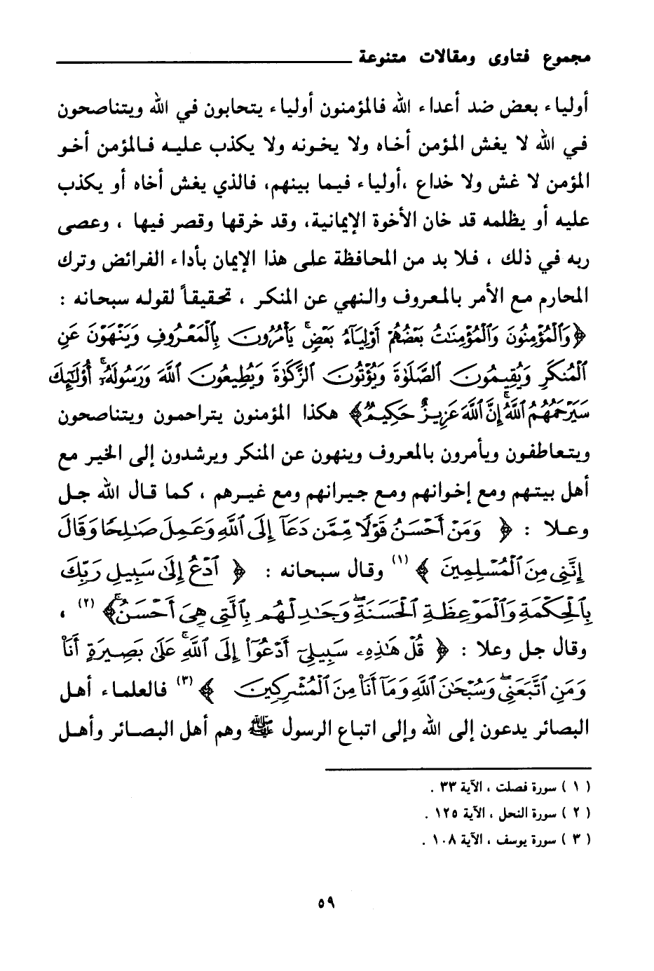 هكذا المؤمنون يتراحمون ويتناصحون ويتعاطفون ويأمرون بالمعروف وينهون عن المنكر ويرشدون إلى الخير مع أهل بيتهم ومع إخوانهم ومع جيرانهم ومع غيرهم، كما قال الله جل وعلا: {وَمَنْ أَحْسَنُ قَوْلًا مِمَّنْ دَعَا إِلَى اللَّهِ وَعَمِلَ صَالِحًا وَقَالَ إِنَّنِي مِنَ الْمُسْلِمِينَ} (¬2) وقال سبحانه: {ادْعُ إِلَى سَبِيلِ رَبِّكَ بِالْحِكْمَةِ وَالْمَوْعِظَةِ الْحَسَنَةِ وَجَادِلْهُمْ بِالَّتِي هِيَ أَحْسَنُ} (¬3) قال جل وعلا: {قُلْ هَذِهِ سَبِيلِي أَدْعُو إِلَى اللَّهِ عَلَى بَصِيرَةٍ أَنَا وَمَنِ اتَّبَعَنِي وَسُبْحَانَ اللَّهِ وَمَا أَنَا مِنَ الْمُشْرِكِينَ} (¬4) فالعلماء أهل البصائر يدعون إلى الله وإلى اتباع الرسول صلى الله عليه وسلم وهم أهل البصائر وأهل