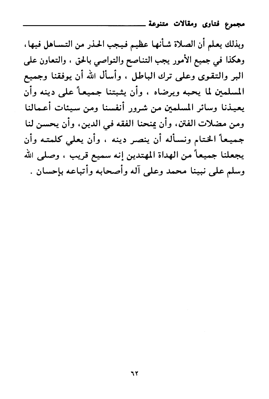 وبذلك يعلم أن الصلاة شأنها عظيم فيجب الحذر من التساهل فيها، وهكذا في جميع الأمور يجب التناصح والتواصي بالحق، والتعاون على البر والتقوى وعلى ترك الباطل وأسأل الله أن يوفقنا وجميع المسلمين لما يحبه ويرضاه، وأن يثبتنا جميعا على دينه وأن يعيذنا وسائر المسلمين من شرور أنفسنا ومن سيئات أعمالنا ومن مضلات الفتن، وأن يمنحنا الفقه في الدين، وأن يحسن لنا جميعا الختام ونسأله أن ينصر دينه، وأن يعلي كلمته وأن يجعلنا جميعا من الهداة المهتدين إنه سميع قريب، وصلى الله وسلم على نبينا محمد وعلى آله وأصحابه وأتباعه بإحسان.
