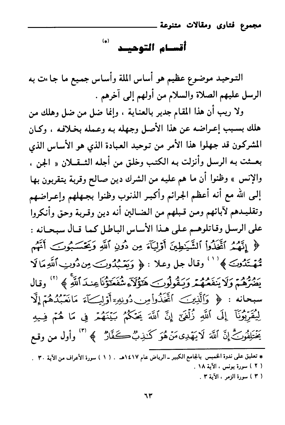 ولا ريب أن هذا المقام جدير بالعناية، وإنما ضل من ضل وهلك من هلك بسبب إعراضه عن هذا الأصل وجهله به وعمله بخلافه، وكان المشركون قد جهلوا هذا الأمر من توحيد العبادة الذي هو الأساس الذي بعثت به الرسل وأنزلت به الكتب وخلق من أجله الثقلان " الجن، والإنس " وظنوا أن ما هم عليه من الشرك دين صالح وقربة يتقربون بها إلى الله مع أنه أعظم الجرائم وأكبر الذنوب وظنوا بجهلهم وإعراضهم وتقليدهم لآبائهم ومن قبلهم من الضالين أنه دين وقربة وحق وأنكروا على الرسل وقاتلوهم على هذا الأساس الباطل كما قال سبحانه: {إِنَّهُمُ اتَّخَذُوا الشَّيَاطِينَ أَوْلِيَاءَ مِنْ دُونِ اللَّهِ وَيَحْسَبُونَ أَنَّهُمْ مُهْتَدُونَ} (¬2) وقال جل وعلا: {وَيَعْبُدُونَ مِنْ دُونِ اللَّهِ مَا لَا يَضُرُّهُمْ وَلَا يَنْفَعُهُمْ وَيَقُولُونَ هَؤُلَاءِ شُفَعَاؤُنَا عِنْدَ اللَّهِ} (¬3) وقال سبحانه: {وَالَّذِينَ اتَّخَذُوا مِنْ دُونِهِ أَوْلِيَاءَ مَا نَعْبُدُهُمْ إِلَّا لِيُقَرِّبُونَا إِلَى اللَّهِ زُلْفَى إِنَّ اللَّهَ يَحْكُمُ بَيْنَهُمْ فِي مَا هُمْ فِيهِ يَخْتَلِفُونَ إِنَّ اللَّهَ لَا يَهْدِي مَنْ هُوَ كَاذِبٌ كَفَّارٌ} (¬4)