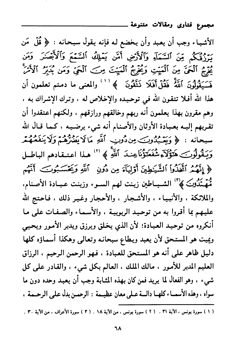 الأشياء ويجب أن يعبد وأن يخضع له فإنه يقول سبحانه: {قُلْ مَنْ يَرْزُقُكُمْ مِنَ السَّمَاءِ وَالْأَرْضِ أَمَّنْ يَمْلِكُ السَّمْعَ وَالْأَبْصَارَ وَمَنْ يُخْرِجُ الْحَيَّ مِنَ الْمَيِّتِ وَيُخْرِجُ الْمَيِّتَ مِنَ الْحَيِّ وَمَنْ يُدَبِّرُ الْأَمْرَ فَسَيَقُولُونَ اللَّهُ فَقُلْ أَفَلَا تَتَّقُونَ} (¬1) والمعنى ما دمتم تعلمون أن هذا الله أفلا تتقون الله في توحيده والإخلاص له، وترك الإشراك به، وهم مقرون بهذا يعلمون أنه ربهم وخالقهم ورازقهم، ولكنهم اعتقدوا أن تقربهم إليه بعبادة الأوثان والأصنام أنه شيء يرضيه، كما قال الله سبحانه: {وَيَعْبُدُونَ مِنْ دُونِ اللَّهِ مَا لَا يَضُرُّهُمْ وَلَا يَنْفَعُهُمْ وَيَقُولُونَ هَؤُلَاءِ شُفَعَاؤُنَا عِنْدَ اللَّهِ} (¬2) هذا اعتقادهم الباطل {إِنَّهُمُ اتَّخَذُوا الشَّيَاطِينَ أَوْلِيَاءَ مِنْ دُونِ اللَّهِ وَيَحْسَبُونَ أَنَّهُمْ مُهْتَدُونَ} (¬3) الشياطين زينت لهم السوء وزينت عبادة الأصنام، والملائكة، والأنبياء، والأشجار، والأحجار وغير ذلك، فاحتج الله عليهم بما أقروا به من توحيد الربوبية، والأسماء والصفات على ما أنكروه من توحيد العبادة؛ لأن الذي يخلق ويرزق ويدبر الأمر ويحيي ويميت هو المستحق لأن يعبد ويطاع سبحانه وتعالى وهكذا أسماؤه كلها دليل ظاهر على أنه هو المستحق للعبادة، فهو الرحمن الرحيم، الرزاق العليم المدبر للأمور، مالك الملك، العالم بكل شيء، والقادر على كل شيء، وهو الفعال لما يريد فمن كان بهذه المثابة وجب أن يعبد وحده دون ما سواه وهذه الأسماء كلها دالة على معان عظيمة: الرحمن يدل على الرحمة،