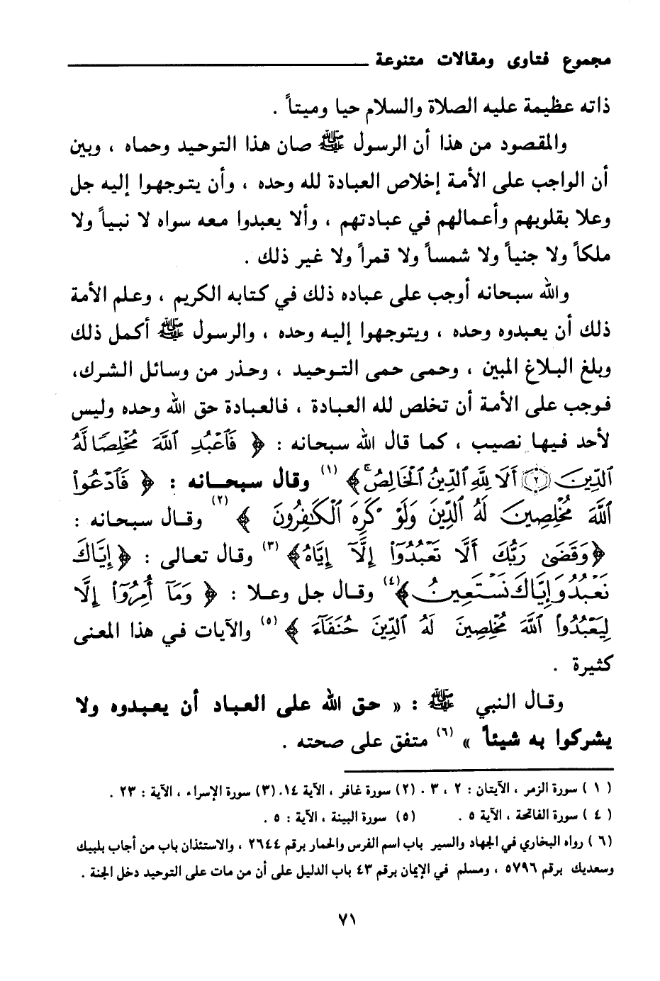 وقال النبي صلى الله عليه وسلم: «حق الله على العباد أن يعبدوه ولا يشركوا به شيئا (¬7) » متفق على صحته.