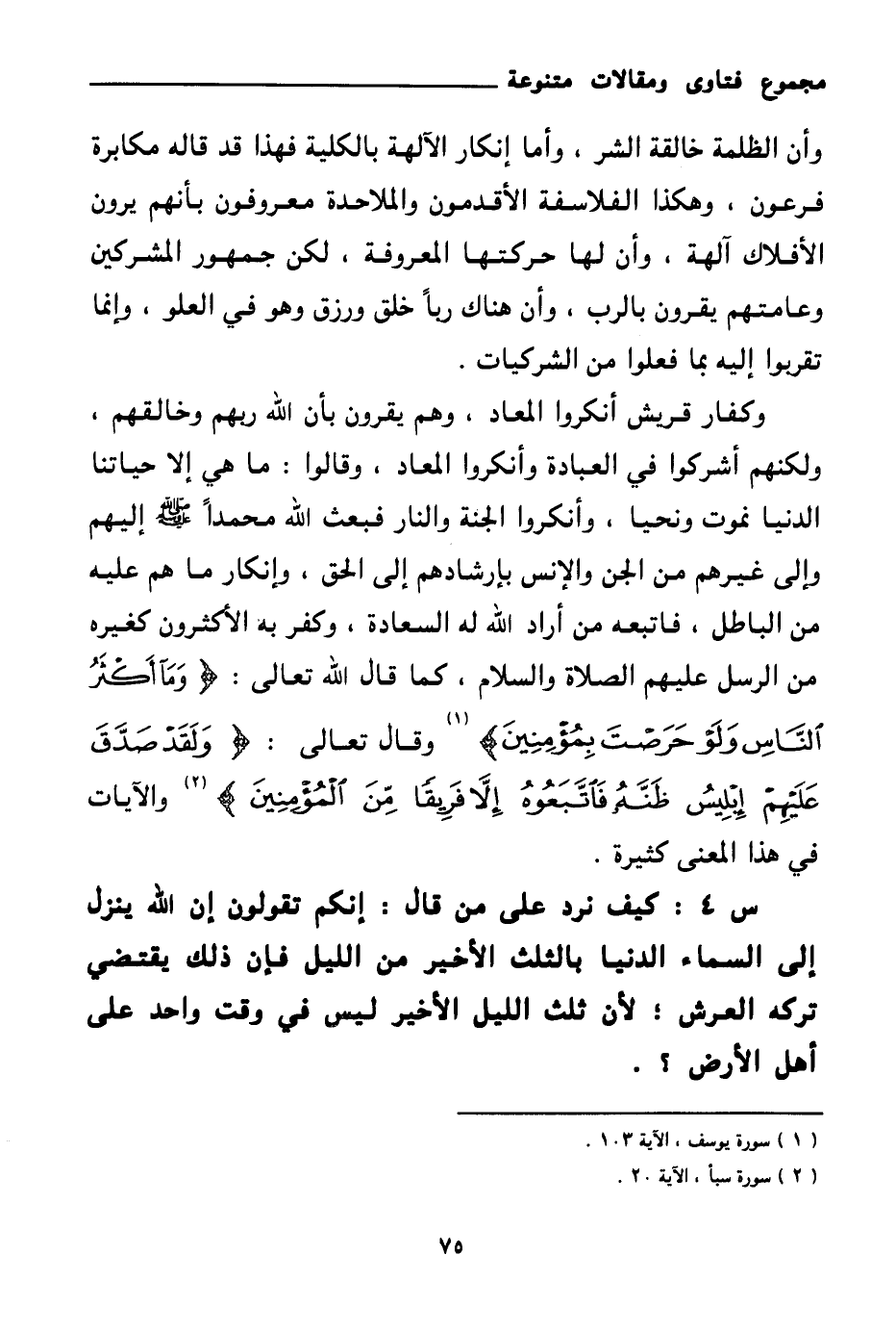 وكفار قريش أنكروا المعاد، وهم يقرون بأن الله ربهم وخالقهم، ولكنهم أشركوا في العبادة وأنكروا المعاد. وقالوا: ما هي إلا حياتنا الدنيا نموت ونحيا، وأنكروا الجنة والنار فبعث الله محمدا صلى الله عليه وسلم إليهم وإلى غيرهم من الجن والإنس بإرشادهم إلى الحق، وإنكار ما هم عليه من الباطل، فاتبعه من أراد الله له السعادة، وكفر به الأكثرون كغيره من الرسل عليهم الصلاة والسلام، كما قال الله تعالى: {وَمَا أَكْثَرُ النَّاسِ وَلَوْ حَرَصْتَ بِمُؤْمِنِينَ} (¬1) وقال تعالى: {وَلَقَدْ صَدَّقَ عَلَيْهِمْ إِبْلِيسُ ظَنَّهُ فَاتَّبَعُوهُ إِلَّا فَرِيقًا مِنَ الْمُؤْمِنِينَ} (¬2) والآيات في هذا المعنى كثيرة.