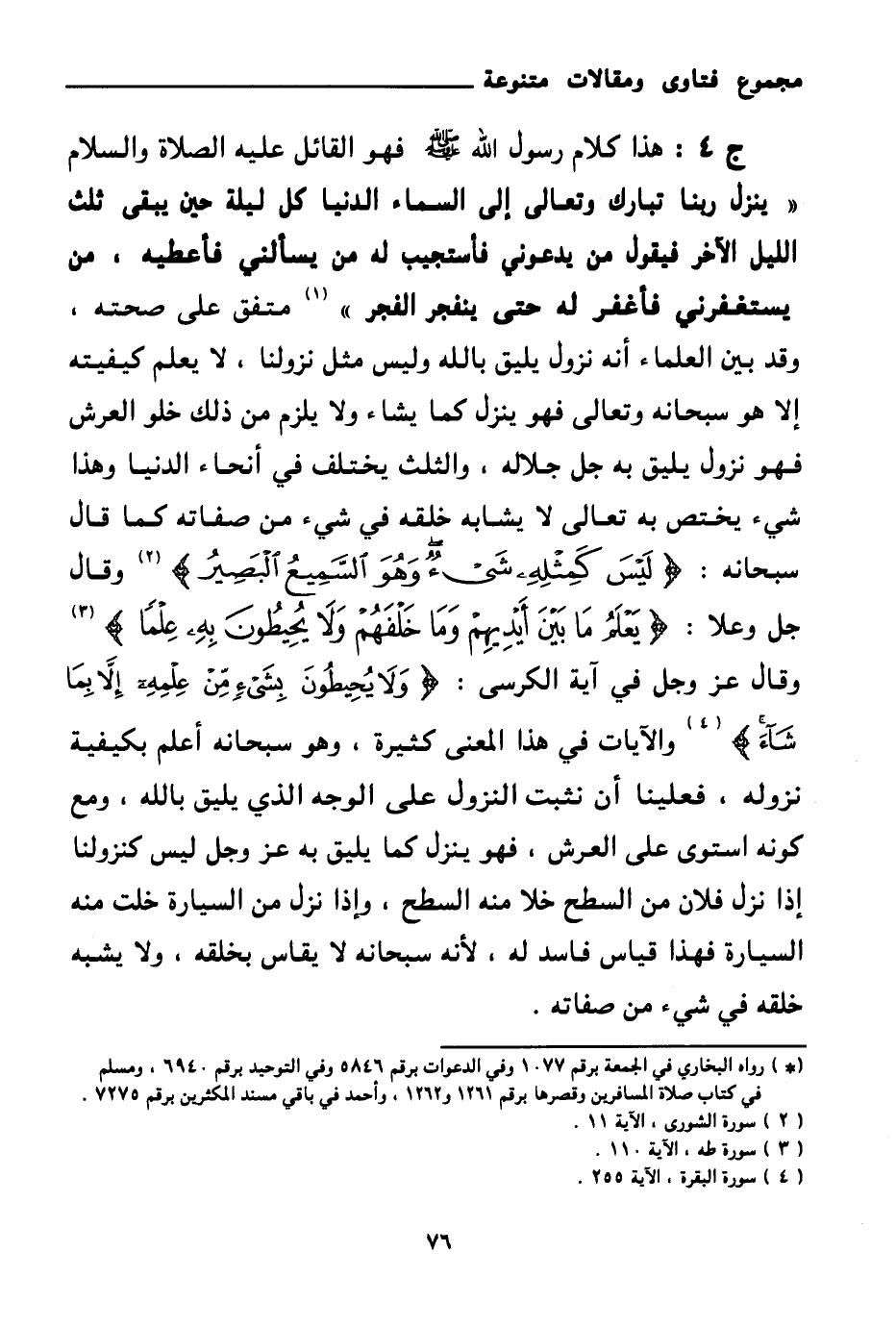 ج 4: هذا كلام رسول الله صلى الله عليه وسلم فهو القائل عليه الصلاة والسلام «ينزل ربنا تبارك وتعالي إلى السماء الدنيا كل ليلة حين يبقى ثلث الليل الآخر فيقول: من يدعوني فأستجيب له، من يسألني فأعطيه، من يستغفرني فأغفر له، حتى ينفجر الفجر (¬1) » متفق على صحته، وقد بين العلماء أنه نزول يليق بالله وليس مثل نزولنا، لا يعلم كيفيته إلا هو سبحانه وتعالى فهو ينزل كما يشاء ولا يلزم من ذلك خلو العرش فهو نزول يليق به جل جلاله، والثلث يختلف في أنحاء الدنيا وهذا شيء يختص به تعالى لا يشابه خلقه في شيء من صفاته كما قال سبحانه: {لَيْسَ كَمِثْلِهِ شَيْءٌ وَهُوَ السَّمِيعُ الْبَصِيرُ} (¬2) وقال جل وعلا: {يَعْلَمُ مَا بَيْنَ أَيْدِيهِمْ وَمَا خَلْفَهُمْ وَلَا يُحِيطُونَ بِهِ عِلْمًا} (¬3) وقال عز وجل في آية الكرسي: {وَلَا يُحِيطُونَ بِشَيْءٍ مِنْ عِلْمِهِ إِلَّا بِمَا شَاءَ} (¬4) والآيات في هذا المعنى كثيرة، وهو سبحانه أعلم بكيفية نزوله، فعلينا أن نثبت النزول على الوجه الذي يليق بالله، ومع كونه استوى على العرش، فهو ينزل كما يليق به عز وجل ليس كنزولنا إذا نزل فلان من السطح خلا منه السطح، وإذا نزل من السيارة خلت منه السيارة فهذا قياس فاسد له، لأنه سبحانه لا يقاس بخلقه، ولا يشبه خلقه في شيء من صفاته.