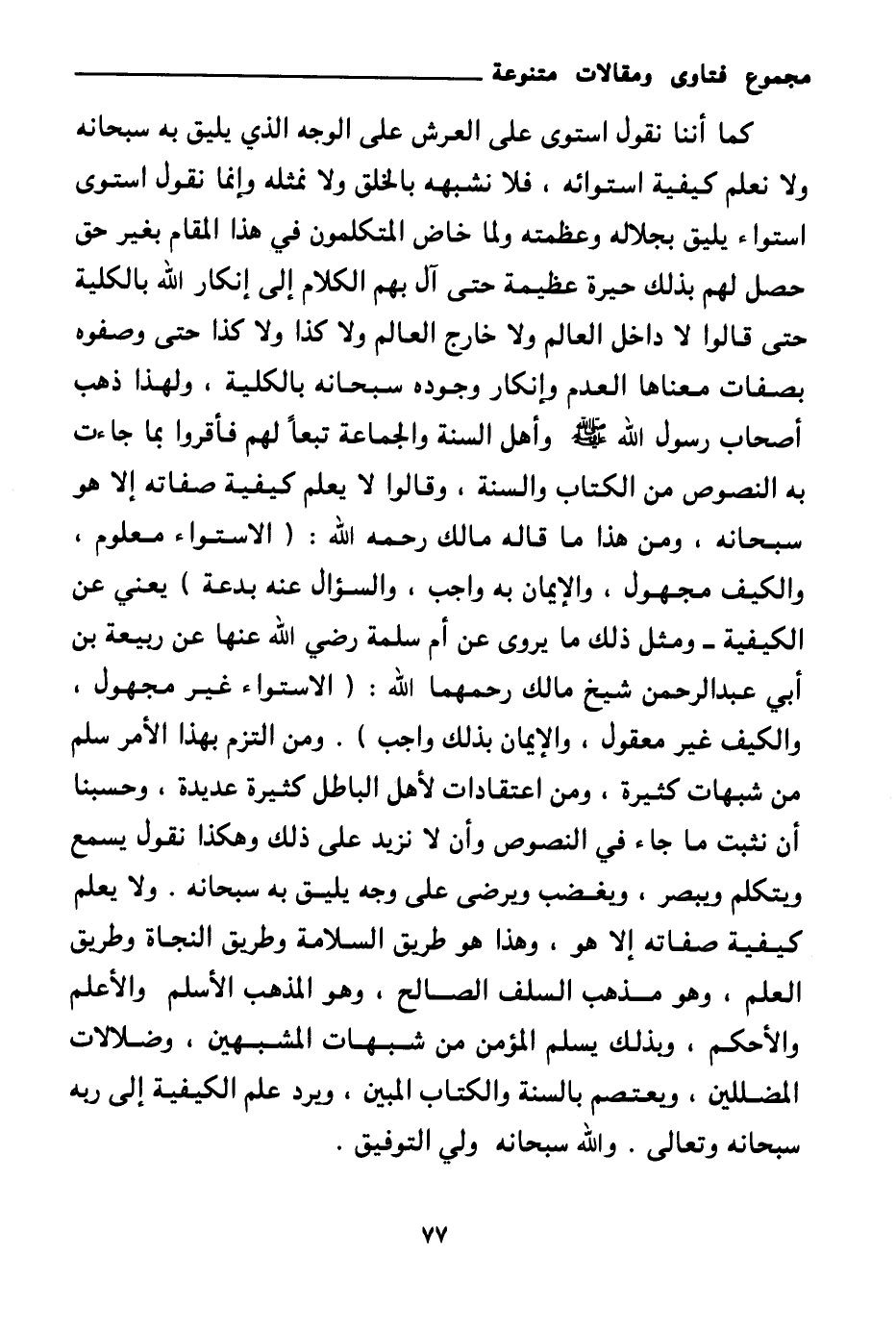 كما أننا نقول استوى على العرش على الوجه الذي يليق به سبحانه ولا نعلم كيفية استوائه فلا نشبهه بالخلق ولا نمثله وإنما نقول: استوى استواء يليق بجلاله وعظمته ولما خاض المتكلمون في هذا المقام بغير حق حصل لهم بذلك حيرة عظيمة حتى آل بهم الكلام إلى إنكار الله بالكلية حتى قالوا: لا داخل العالم ولا خارج العالم ولا كذا ولا كذا حتى وصفوه بصفات معناها العدم وإنكار وجوده سبحانه بالكلمة ولهذا ذهب أصحاب رسول الله صلى الله عليه وسلم وأهل السنة والجماعة تبعا لهم فأقروا بما جاءت به النصوص من الكتاب والسنة وقالوا لا يعلم كيفية صفاتة إلا هو سبحانه، ومن هذا ما قاله مالك رحمه الله: (الاستواء معلوم، والكيف مجهول، والإيمان به واجب، والسؤال عنه بدعة) يعني عن الكيفية- ومثل ذلك ما يروى عن أم سلمة رضي الله عنها عن ربيعه بن أبي عبد الرحمن شيخ مالك رحمهما الله: (الاستواء غير مجهول، والكيف غير معقول، والإيمان بذلك واجب) .