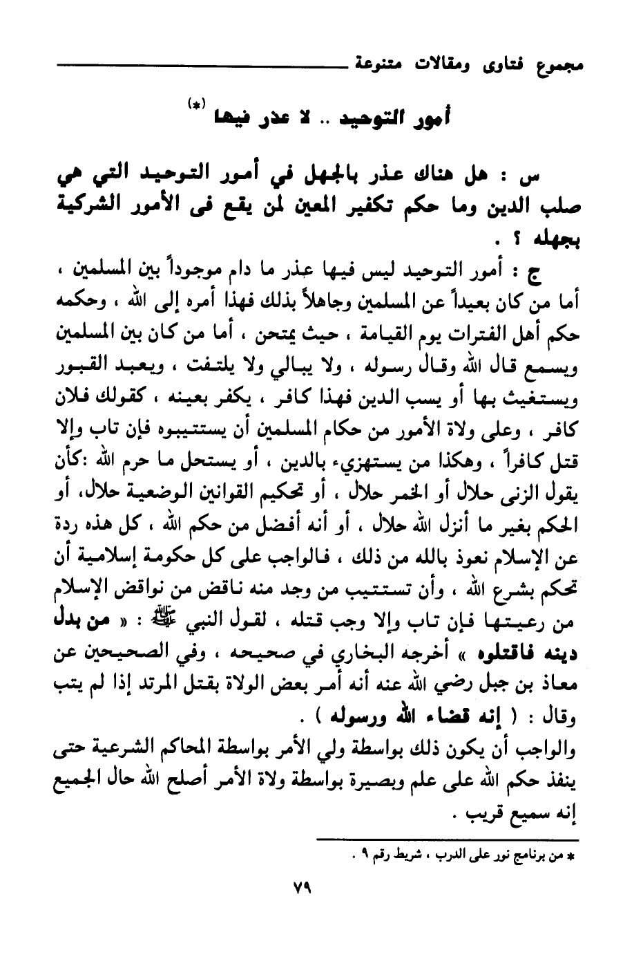 ج: أمور التوحيد ليس فيها عذر ما دام موجودا بين المسلمين، أما من كان بعيدا عن المسلمين وجاهلا بذلك فهذا أمره إلى الله، وحكمه حكم أهل الفترات يوم القيامة، حيث يمتحن، أما من كان بين المسلمين ويسمع قال الله وقال رسوله، ولا يبالي ولا يلتفت، ويعبد القبور ويستغيث بها أو يسب الدين فهذا كافر، يكفر بعينه، كقولك فلان كافر، وعلى ولاة الأمور من حكام المسلمين أن يستتيبوه فإن تاب وإلا قتل كافرا، وهكذا من يستهزئ بالدين، أو يستحل ما حرم الله: كأن يقول الزنى حلال أو الخمر حلال، أو تحكيم القوانين الوضعية حلال، أو الحكم بغير ما أنزل الله حلال، أو أنه أفضل من حكم الله، كل هذه ردة عن الإسلام نعوذ بالله من ذلك، فالواجب على كل حكومة إسلامية أن تحكم بشرع الله، وأن تستتيب من وجد منه ناقض من نواقض الإسلام من رعيتها فإن تاب وإلا وجب قتله، لقول النبي صلى الله عليه وسلم: «من بدل دينه فاقتلوه (¬2) » أخرجه البخاري في صحيحه، وفي الصحيحين «عن معاذ بن جبل رضي الله عنه أنه أمر بعض الولاة بقتل المرتد إذا لم يتب وقال: إنه قضاء الله ورسوله (¬3) » .