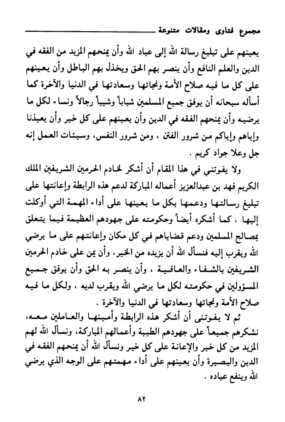 ولا يفوتني في هذا المقام أن أشكر لخادم الحرمين الشريفين الملك الكريم فهد بن عبد العزيز أعماله المباركة لدعم هذه الرابطة وإعانتها على تبليغ رسالتها ودعمها بكل ما يعينها على أداء المهمة التي أوكلت إليها، كما أشكره أيضا وحكومته على جهودهم العظيمة فيما يتعلق بمصالح المسلمين ودعم قضاياهم في كل مكان وإعانتهم على ما يرضي الله ويقرب إليه فنسأل الله أن يزيده من الخير، وأن يمن على خادم الحرمين الشريفين بالشفاء والعافية، وأن ينصر به الحق وأن يوفق جميع المسئولين في حكومته لكل ما يرضي الله ويقرب لديه، ولكل ما فيه صلاح الأمة ونجاتها وسعادتها في الدنيا والآخرة.