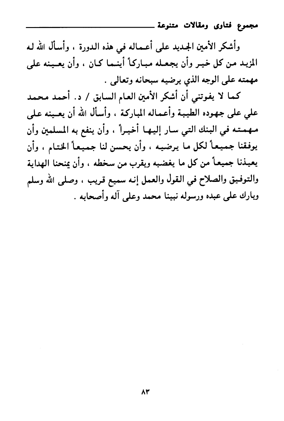 كما لا يفوتني أن أشكر الأمين العام السابق \ د. أحمد محمد علي على جهوده الطيبة وأعماله المباركة، وأسأل الله أن يعينه على مهمته في البنك التي سار إليها أخيرا، وأن ينفع به المسلمين وأن يوفقنا جميعا لكل ما يرضيه، وأن يحسن لنا جميعا الختام، وأن يعيذنا جميعا من كل ما يغضبه ويقرب من سخطه، وأن يمنحنا الهداية والتوفيق والصلاح في القول والعمل إنه سميع قريب، وصلى الله وسلم وبارك على عبده ورسوله نبينا محمد وعلى آله وأصحابه.