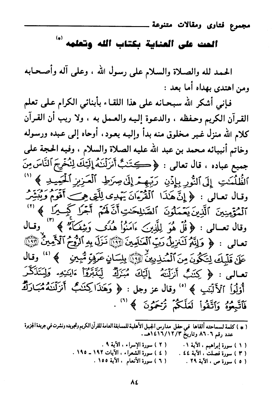 فإني أشكر الله سبحانه على هذا اللقاء بأبنائي الكرام على تعلم القرآن الكريم وحفظه، والدعوة إليه والعمل به، ولا ريب أن القرآن كلام الله منزل غير مخلوق منه بدأ وإليه يعود، أوحاه إلى عبده ورسوله وخاتم أنبيائه محمد بن عبد الله عليه الصلاة والسلام، وفيه الحجة على جميع عباده. قال تعالى: {كِتَابٌ أَنْزَلْنَاهُ إِلَيْكَ لِتُخْرِجَ النَّاسَ مِنَ الظُّلُمَاتِ إِلَى النُّورِ بِإِذْنِ رَبِّهِمْ إِلَى صِرَاطِ الْعَزِيزِ الْحَمِيدِ} (¬1) وقال تعالى: {إِنَّ هَذَا الْقُرْآنَ يَهْدِي لِلَّتِي هِيَ أَقْوَمُ وَيُبَشِّرُ الْمُؤْمِنِينَ الَّذِينَ يَعْمَلُونَ الصَّالِحَاتِ أَنَّ لَهُمْ أَجْرًا كَبِيرًا} (¬2) وقال تعالى: {قُلْ هُوَ لِلَّذِينَ آمَنُوا هُدًى وَشِفَاءٌ} (¬3) وقال تعالى: {وَإِنَّهُ لَتَنْزِيلُ رَبِّ الْعَالَمِينَ} (¬4) {نَزَلَ بِهِ الرُّوحُ الْأَمِينُ} (¬5) {عَلَى قَلْبِكَ لِتَكُونَ مِنَ الْمُنْذِرِينَ} (¬6) {بِلِسَانٍ عَرَبِيٍّ مُبِينٍ} (¬7) وقال تعالى: {كِتَابٌ أَنْزَلْنَاهُ إِلَيْكَ مُبَارَكٌ لِيَدَّبَّرُوا آيَاتِهِ وَلِيَتَذَكَّرَ أُولُو الْأَلْبَابِ} (¬8) وقال عز وجل: {وَهَذَا كِتَابٌ أَنْزَلْنَاهُ مُبَارَكٌ فَاتَّبِعُوهُ وَاتَّقُوا لَعَلَّكُمْ تُرْحَمُونَ} (¬9)