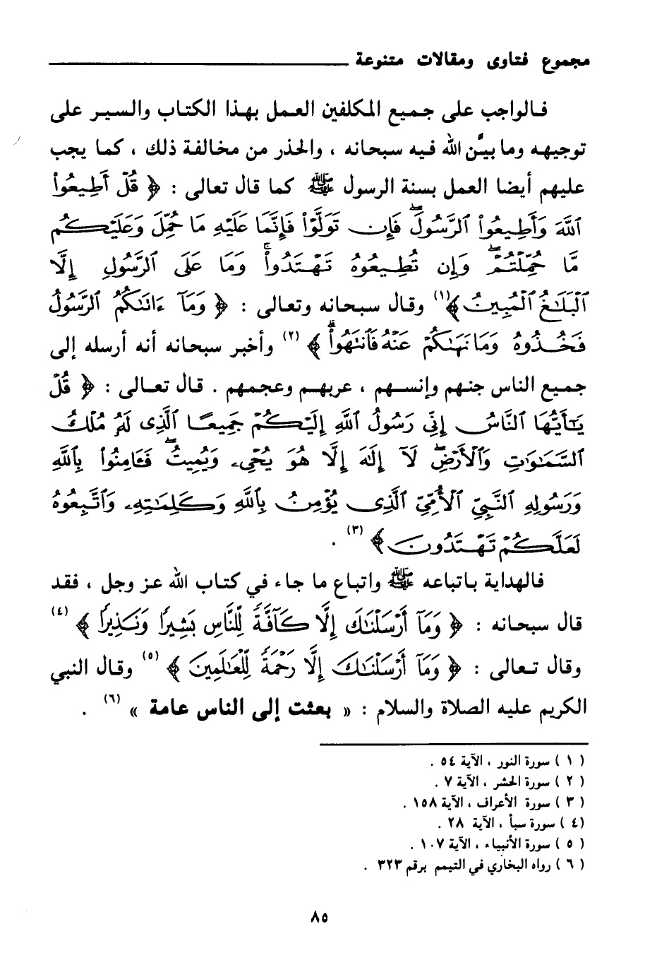 وقال سبحانه وتعالى: {وَمَا آتَاكُمُ الرَّسُولُ فَخُذُوهُ وَمَا نَهَاكُمْ عَنْهُ فَانْتَهُوا} (¬2) وأخبر سبحانه أنه أرسله إلى جميع الناس جنهم وإنسهم، عربهم وعجمهم. قال تعالى: {قُلْ يَا أَيُّهَا النَّاسُ إِنِّي رَسُولُ اللَّهِ إِلَيْكُمْ جَمِيعًا الَّذِي لَهُ مُلْكُ السَّمَاوَاتِ وَالْأَرْضِ لَا إِلَهَ إِلَّا هُوَ يُحْيِي وَيُمِيتُ فَآمِنُوا بِاللَّهِ وَرَسُولِهِ النَّبِيِّ الْأُمِّيِّ الَّذِي يُؤْمِنُ بِاللَّهِ وَكَلِمَاتِهِ وَاتَّبِعُوهُ لَعَلَّكُمْ تَهْتَدُونَ} (¬3)
