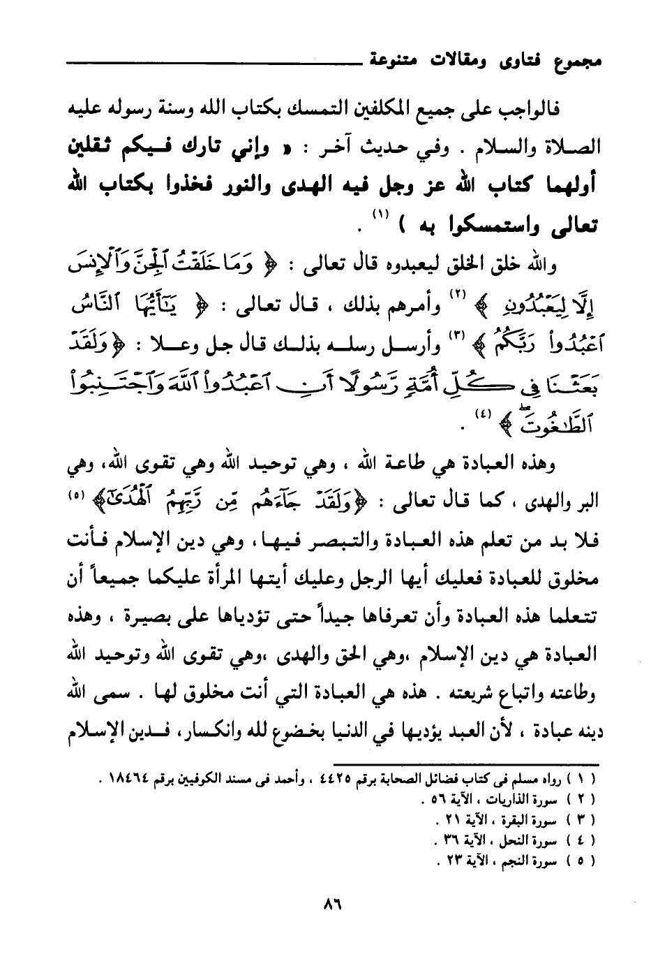 وهذه العبادة هي طاعة الله، وهي توحيد الله وهي تقوى الله، وهي البر والهدى، كما قال تعالى: {وَلَقَدْ جَاءَهُمْ مِنْ رَبِّهِمُ الْهُدَى} (¬5) فلا بد من تعلم هذه العبادة والتبصر فيها، وهي دين الإسلام فأنت مخلوق للعبادة فعليك أيها الرجل وعليك أيتها المرأة عليكما جميعا أن تتعلما هذه العبادة وأن تعرفاها جيدا حتى تؤدياها على بصيرة، وهذه العبادة هي دين الإسلام، وهي الحق والهدى، وهي تقوى الله وتوحيد الله وطاعته واتباع شريعته.