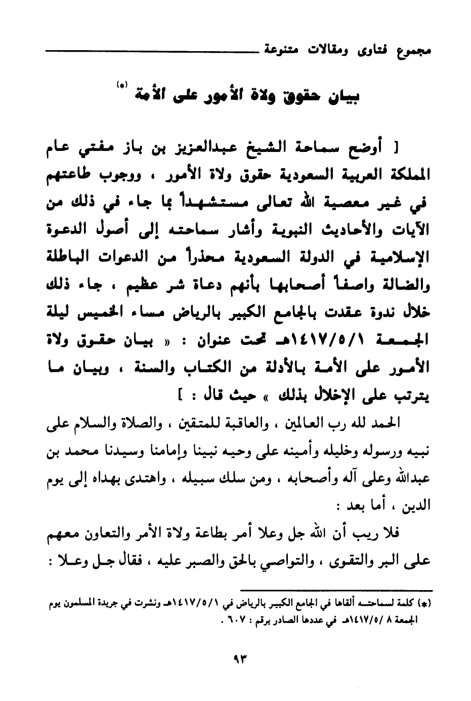 [أوضح سماحة الشيخ عبد العزيز بن باز مفتي عام المملكة العربية السعودية حقوق ولاة الأمور، ووجوب طاعتهم في غير معصية الله تعالى مستشهدا بما جاء في ذلك من الآيات والأحاديث النبوية وأشار سماحته إلى أصول الدعوة الإسلامية في الدولة السعودية محذرا من الدعوات الباطلة والضالة واصفا أصحابها بأنهم دعاة شر عظيم وجاء ذلك خلال ندوة عقدت بالجامع الكبير بالرياض مساء الخميس ليلة الجمعة 1 \ 5 \ 1417 هـ تحت عنوان: " بيان حقوق ولاة الأمور على الأمة بالأدلة من الكتاب والسنة، وبيان ما يترتب على الإخلال بذلك " حيث قال:] .
