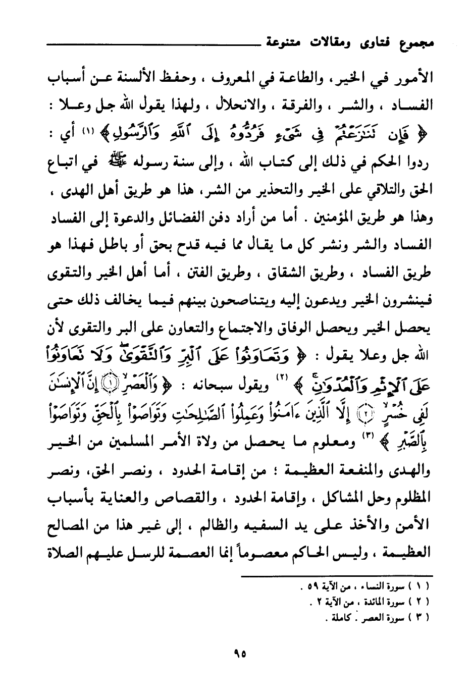 ومعلوم ما يحصل من ولاة الأمر المسلمين من الخير والهدى والمنفعة العظيمة. من إقامة الحدود، ونصر الحق، ونصر المظلوم وحل المشاكل، وإقامة الحدود، والقصاص والعناية بأسباب الأمن والأخذ على يد السفيه والظالم، إلى غير هذا من المصالح العظيمة، وليس الحاكم معصوما إنما العصمة للرسل عليهم الصلاة