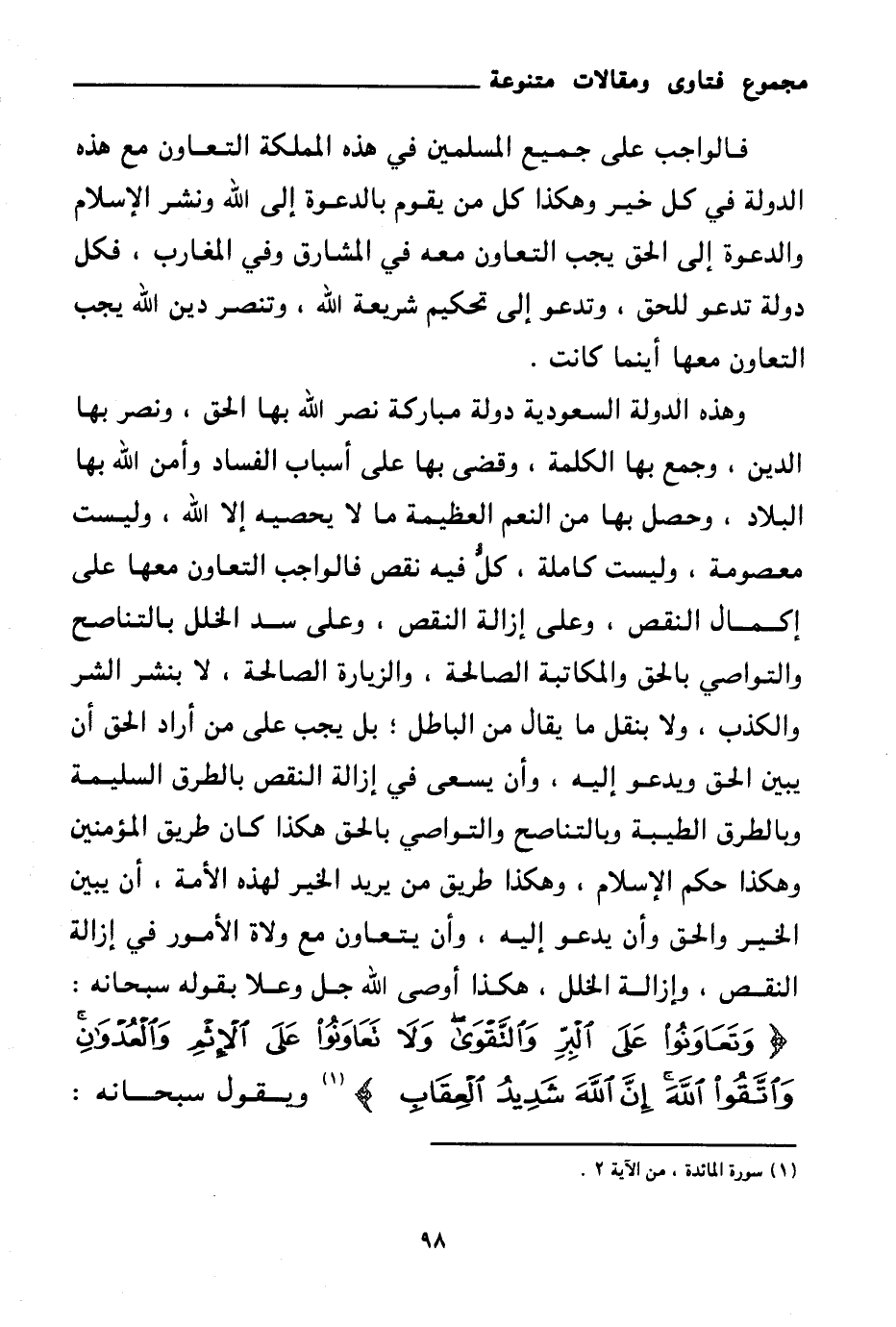 وهذه الدولة السعودية دولة مباركة نصر الله بها الحق، ونصر بها الدين، وجمع بها الكلمة، وقضى بها على أسباب الفساد وأمن الله بها البلاد، وحصل بها من النعم العظيمة ما لا يحصيه إلا الله، وليست معصومة، وليست كاملة، كل فيه نقص فالواجب التعاون معها على إكمال النقص، وعلى إزالة النقص، وعلى سد الخلل بالتناصح والتواصي بالحق والمكاتبة الصالحة، والزيارة الصالحة، لا بنشر الشر والكذب، ولا بنقل ما يقال من الباطل؛ بل يجب على من أراد الحق أن يبين الحق ويدعو إليه، وأن يسعى في إزالة النقص بالطرق السليمة وبالطرق الطيبة وبالتناصح والتواصي بالحق هكذا كان طريق المؤمنين وهكذا حكم الإسلام، وهكذا طريق من يريد الخير لهذه الأمة، أن يبين الخير والحق وأن يدعو إليه، وأن يتعاون مع ولاة الأمور في إزالة النقص، وإزالة الخلل، هكذا أوصى الله جل وعلا بقوله سبحانه: {وَتَعَاوَنُوا عَلَى الْبِرِّ وَالتَّقْوَى وَلَا تَعَاوَنُوا عَلَى الْإِثْمِ وَالْعُدْوَانِ وَاتَّقُوا اللَّهَ إِنَّ اللَّهَ شَدِيدُ الْعِقَابِ} (¬1)