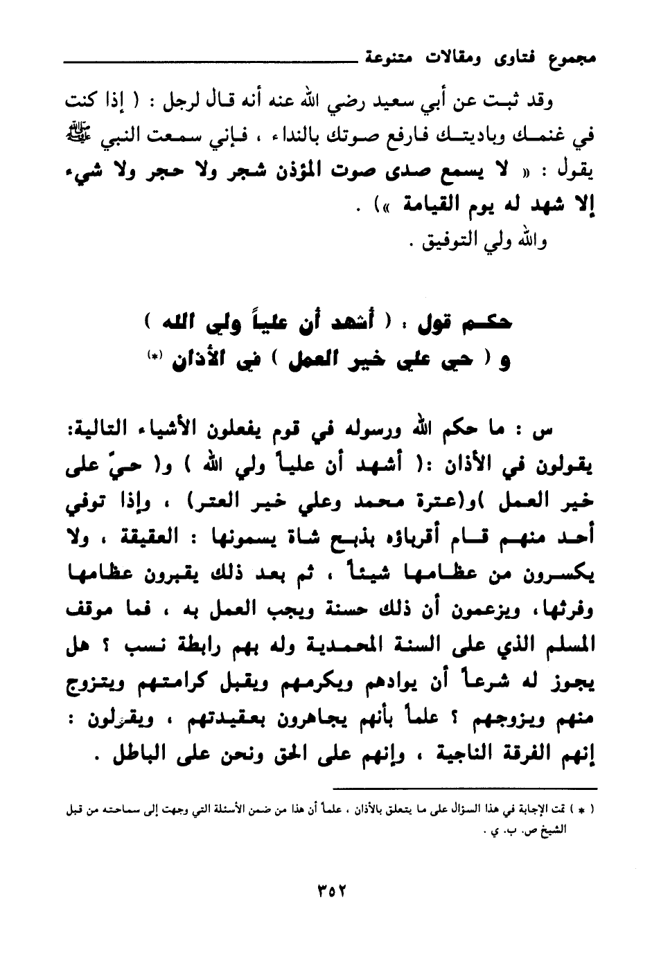 وقد ثبت عن أبي سعيد رضي الله عنه أنه قال لرجل: «إذا كنت في غنمك وباديتك فارفع صوتك بالنداء، فإني سمعت النبي صلى الله عليه وسلم يقول: لا يسمع صدى صوت المؤذن شجر ولا حجر ولا شيء إلا شهد له يوم القيامة (¬1) » .