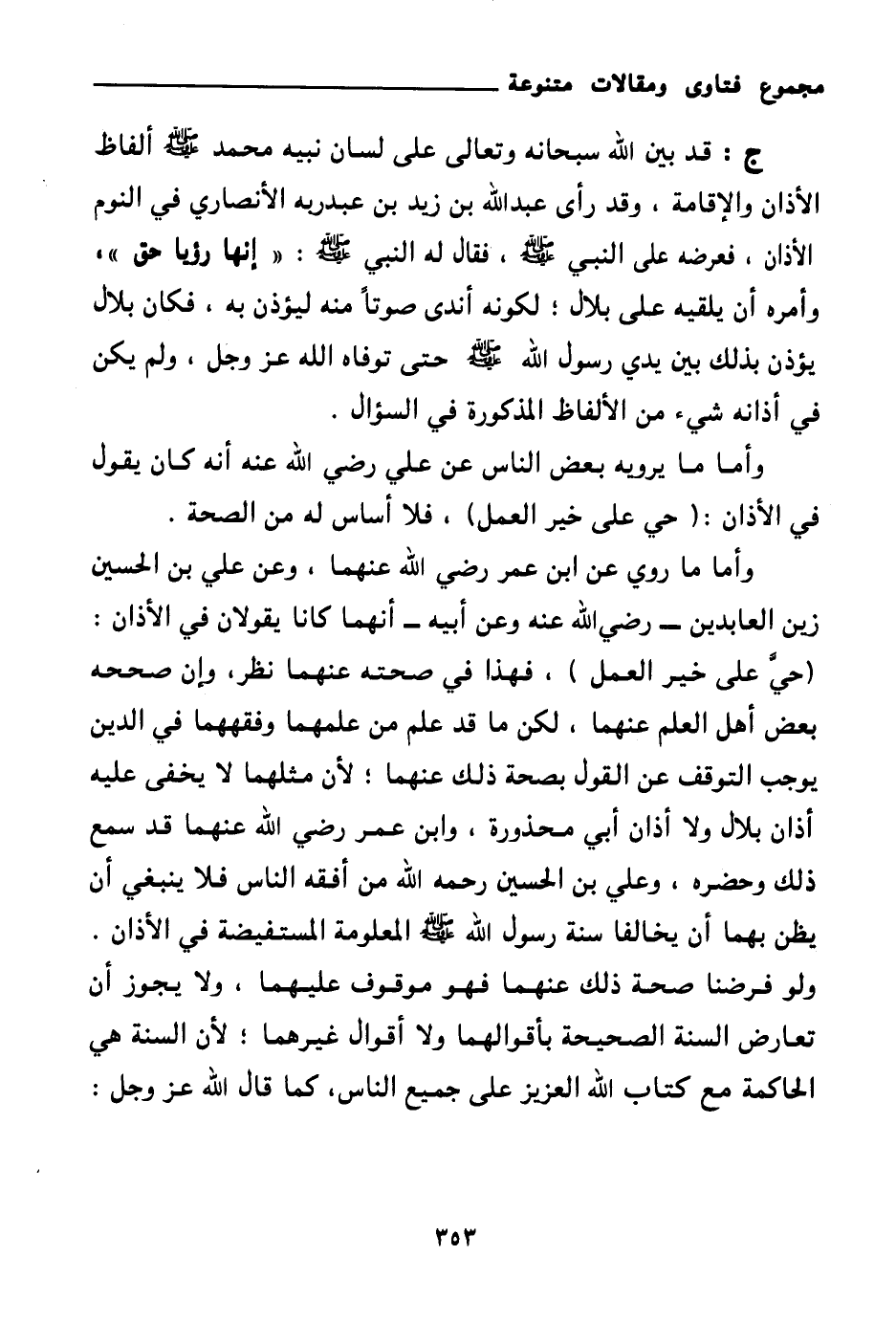 وأما ما يرويه بعض الناس عن علي رضي الله عنه أنه كان يقول في الأذان: (حي على خير العمل) ، فلا أساس له من الصحة. وأما ما روي عن ابن عمر رضي الله عنهما، وعن علي بن الحسين زين العابدين - رضي الله عنه وعن أبيه- أنهما كانا يقولان في الأذان: (حي على خير العمل) ، فهذا في صحته عنهما نظر، وإن صححه بعض أهل العلم عنهما، لكن ما قد علم من علمهما وفقههما في الدين يوجب التوقف عن القول بصحة ذلك عنهما؛ لأن مثلهما لا يخفي عليه أذان بلال ولا أذان أبي محذورة، وابن عمر رضي الله عنهما قد سمع ذلك وحضره، وعلي بن الحسين رحمه الله من أفقه الناس فلا ينبغي أن يظن بهما أن يخالفا سنة رسول الله صلى الله عليه وسلم المعلومة المستفيضة في الأذان.