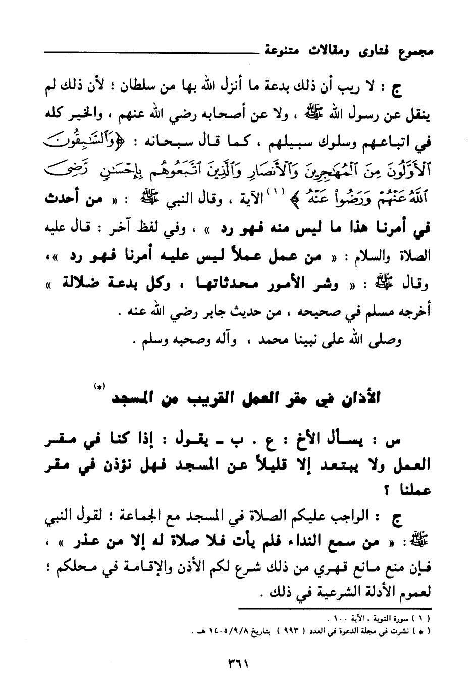 ج: لا ريب أن ذلك بدعة ما أنزل الله بها من سلطان؛ لأن ذلك لم ينقل عن رسول الله صلى الله عليه وسلم، ولا عن أصحابه رضي الله عنهم، والخير كله في اتباعهم وسلوك سبيلهم، كما قال سبحانه: {وَالسَّابِقُونَ الْأَوَّلُونَ مِنَ الْمُهَاجِرِينَ وَالْأَنْصَارِ وَالَّذِينَ اتَّبَعُوهُمْ بِإِحْسَانٍ رَضِيَ اللَّهُ عَنْهُمْ وَرَضُوا عَنْهُ} (¬1) الآية، وقال النبي صلى الله عليه وسلم: «من أحدث في أمرنا هذا ما ليس منه فهو رد (¬2) » وفي لفظ آخر: قال عليه الصلاة والسلام: «من عمل عملا ليس عليه أمرنا فهو رد (¬3) » . وقال صلى الله عليه وسلم: «وشر الأمور محدثاتها وكل بدعة ضلالة (¬4) » أخرجه مسلم في صحيحه، من حديث جابر رضي الله عنه.