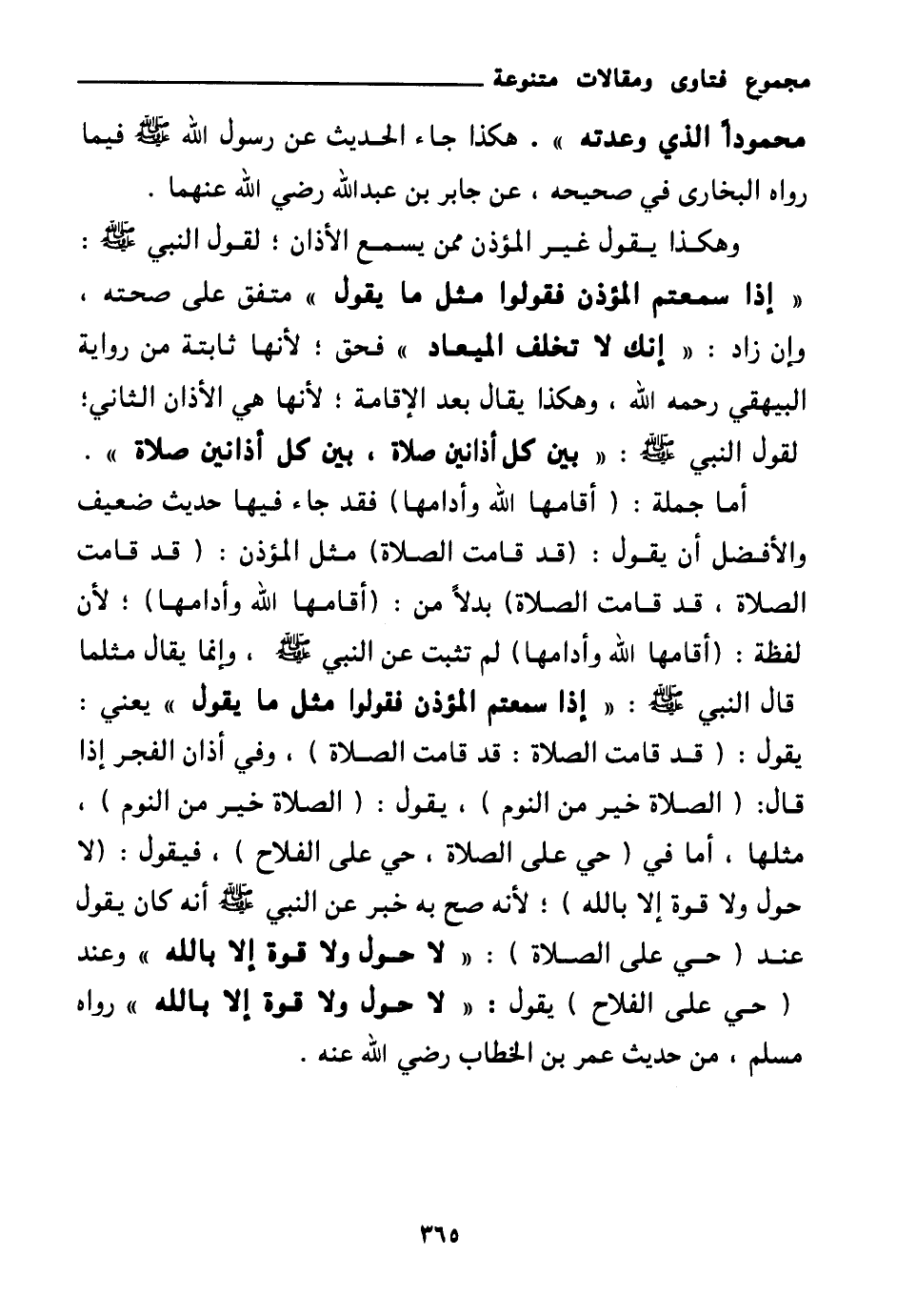 هكذا جاء الحديث عن رسول الله صلى الله عليه وسلم فيما رواه البخاري في صحيحه، عن جابر بن عبد الله رضي الله عنهما. وهكذا يقول غير المؤذن ممن يسمع الأذان؛ لقول النبي صلى الله عليه وسلم: «إذا سمعتم المؤذن فقولوا مثل ما يقول (¬2) » متفق على صحته، وإن زاد: " إنك لا تخلف الميعاد " فحق؛ لأنها ثابتة من رواية البيهقي رحمه الله، وهكذا يقال بعد الإقامه؛ لأنها هي الأذان الثاني، لقول النبي صلى الله عليه وسلم: «بين كل أذانين صلاة (¬3) » . أما جملة: (أقامها الله وأدامها) فقد جاء فيها حديث ضعيف والأفضل أن يقول: (قد قامت الصلاة) مثل المؤذن: (قد قامت الصلاة، قد قامت الصلاة) بدلا من: (أقامها الله وأدامها) ؛ لأن لفظة: (أقامها الله وأدامها) لم تثبت عن النبي صلى الله عليه وسلم، وإنما يقال مثلما قال النبي صلى الله عليه وسلم: «إذا سمعتم المؤذن فقولوا مثل ما يقول (¬4) » يعني: يقول: (قد قامت الصلاة: قد قامت الصلاة) ، وفي أذان الفجر إذا قال: (الصلاة خير من النوم) ، يقول: (الصلاة خير من النوم) ، مثلها، أما في (حي على الصلاة، حي على الفلاح) ، فيقول: (لا حول ولا قوة إلا بالله) ؛ لأنه صح به خبر عن النبي صلى الله عليه وسلم أنه «كان يقول عند (حي على الصلاة) : " لا حول ولا قوة إلا بالله " وعند (حي على الفلاح) يقول: " لا حول ولا قوة إلا بالله (¬5) » رواه مسلم، من حديث عمر بن الخطاب رضي الله عنه.