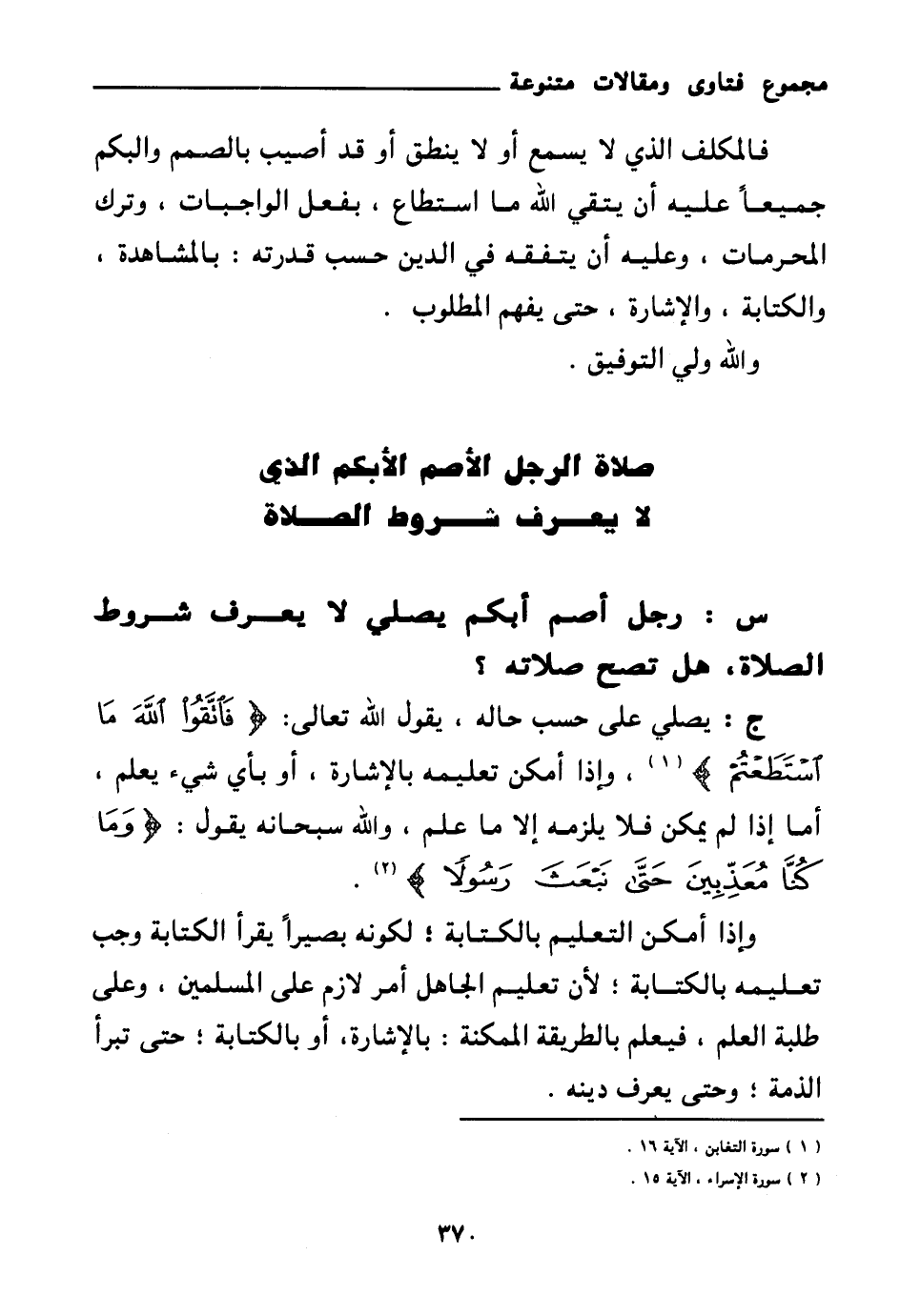 ج: يصلي على حسب حاله، يقول الله تعالى: {فَاتَّقُوا اللَّهَ مَا اسْتَطَعْتُمْ} (¬1) وإذا أمكن تعليمه بالإشارة، أو بأي شيء يعلم، أما إذا لم يمكن فلا يلزمه إلا ما علم، والله سبحانه يقول: {وَمَا كُنَّا مُعَذِّبِينَ حَتَّى نَبْعَثَ رَسُولًا} (¬2)