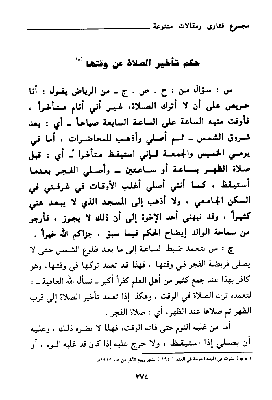 ج: من يتعمد ضبط الساعة إلى ما بعد طلوع الشمس حتى لا يصلي فريضة الفجر في وقتها، فهذا قد تعمد تركها في وقتها، وهو كافر بهذا عند جمع كثير من أهل العلم كفرا أكبر - نسأل الله العافية - لتعمده ترك الصلاة في الوقت، وهكذا إذا تعمد تأخير الصلاة إلى قرب الظهر ثم صلاها عند الظهر، أي: صلاة الفجر. أما من غلبه النوم حتى فاته الوقت، فهذا لا يضره ذلك، وعليه أن يصلي إذا استيقظ، ولا حرج عليه إذا كان قد غلبه النوم، أو