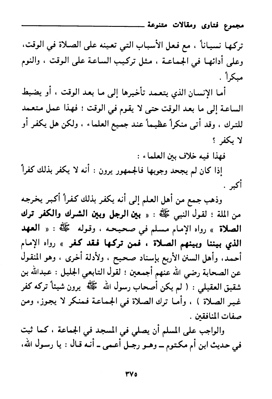 وذهب جمع من أهل العلم إلى أنه يكفر بذلك كفرا أكبر يخرجه من الملة، لقول النبي صلى الله عليه وسلم: «بين الرجل وبين الشرك والكفر ترك الصلاة (¬1) » رواه الإمام مسلم في صحيحه، وقوله صلى الله عليه وسلم: «العهد الذي بيننا وبينهم الصلاة فمن تركها فقد كفر (¬2) » رواه الإمام أحمد، وأهل السنن الأربع بإسناد صحيح، ولأدلة أخرى، وهو المنقول عن الصحابة رضي الله عنهم أجمعين، لقول التابعي الجليل: عبد الله بن شقيق العقيلي: (لم يكن أصحاب رسول الله صلى الله عليه وسلم يرون شيئا تركه كفر غير الصلاة) ، وأما ترك الصلاة في الجماعة فمنكر لا يجوز، ومن صفات المنافقين.