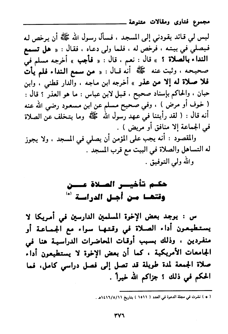 ليس لي قائد يقودني إلى المسجد، فسأل رسول الله صلى الله عليه وسلم أن يرخص له فيصلي في بيته، فرخص له، فلما ولى دعاه، فقال: هل تسمع النداء بالصلاة؟ قال نعم قال فأجب (¬1) » أخرجه مسلم في صحيحه، وثبت عنه صلى الله عليه وسلم أنه قال: «من سمع النداء فلم يأت فلا صلاة له إلا من عذر (¬2) » أخرجه ابن ماجه، والدارقطني، وابن حبان، والحاكم بإسناد صحيح، قيل لابن عباس: ما هو العذر؟ قال: (خوف أو مرض) ، وفي صحيح مسلم عن ابن مسعود رضي الله عنه أنه قال: «لقد رأيتنا في عهد رسول الله صلى الله عليه وسلم وما يتخلف عن الصلاة في الجماعة إلا منافق أو مريض (¬3) » والمقصود: أنه يجب على المؤمن أن يصلي في المسجد، ولا يجوز له التساهل والصلاة في البيت مع قرب المسجد. والله ولي التوفيق.
