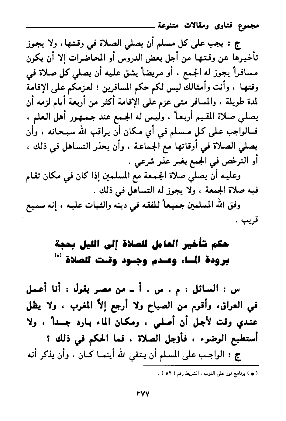 حكم تأخير العامل للصلاة إلى الليل بحجة برودة الماء وعدم وجود وقت للصلاة (¬1) .