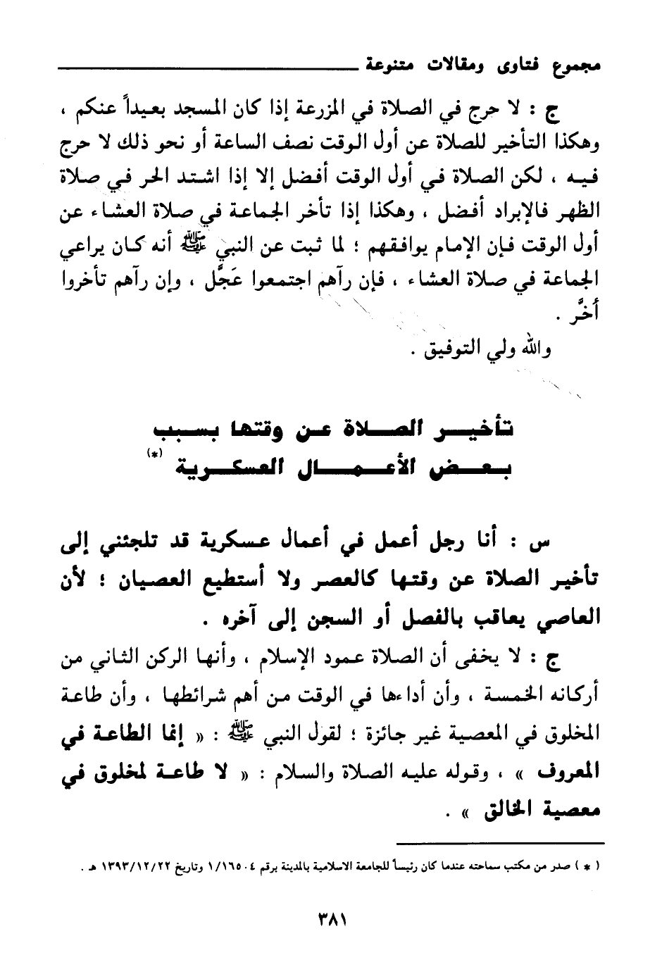 ج: لا يخفى أن الصلاة عمود الإسلام، وأنها الركن الثاني من أركانه الخمسة، وأن أداءها في الوقت من أهم شرائطها، وأن طاعة المخلوق في المعصية غير جائزة. لقول النبي صلى الله عليه وسلم: «إنما الطاعة في المعروف (¬1) » وقوله عليه الصلاة والسلام: «لا طاعة لمخلوق في معصية الخالق (¬2) » .