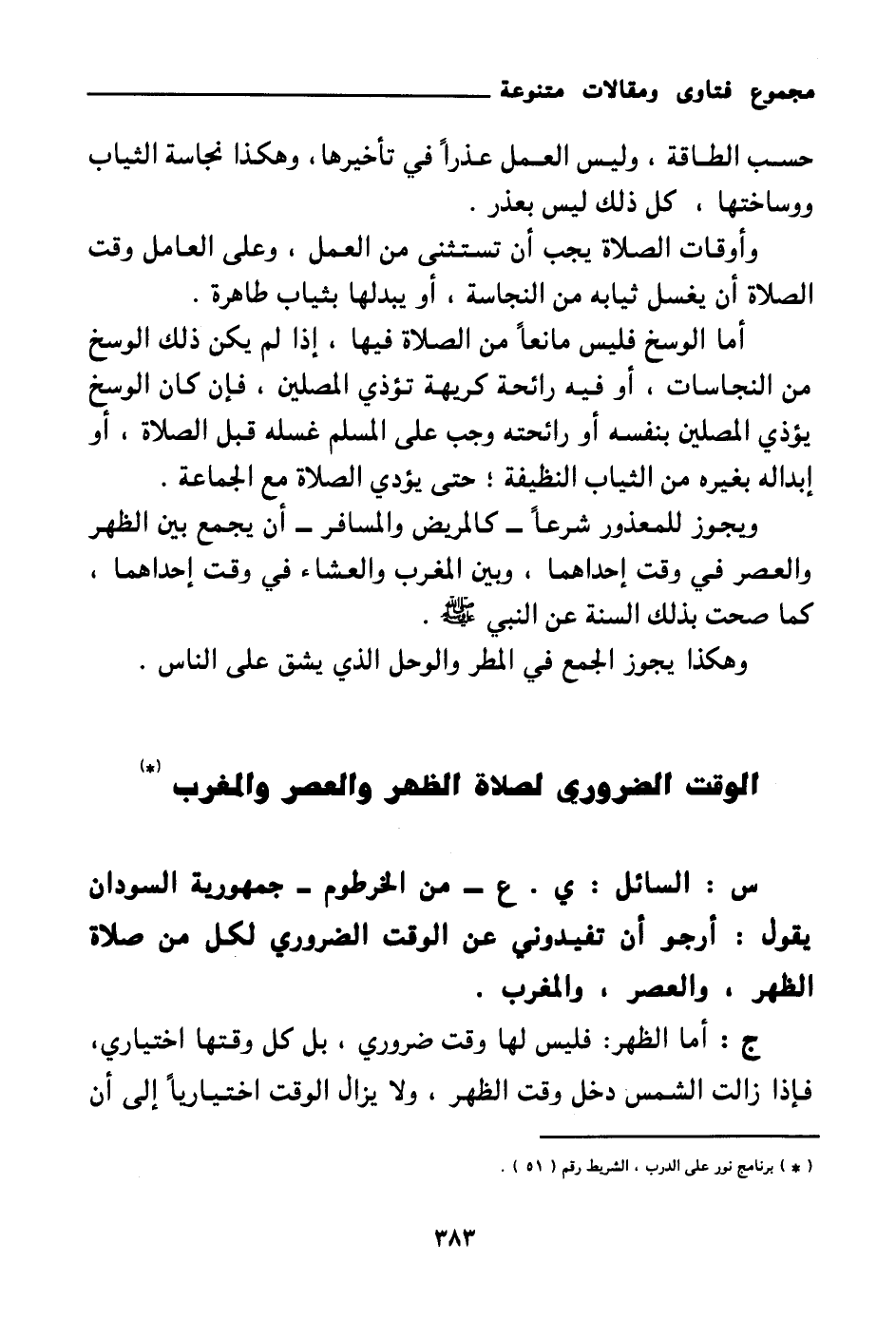 س: السائل: ي. ع - من الخرطوم - جمهورية السودان يقول: أرجو أن تفيدوني عن الوقت الضروري لكل من صلاة الظهر، والعصر، والمغرب.