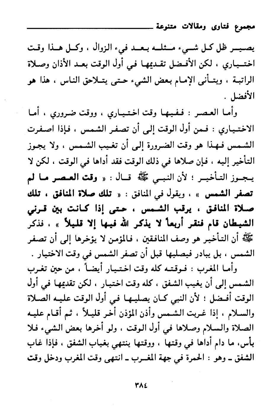 يصير ظل كل شيء مثله بعد فيء الزوال، وكل هذا وقت اختياري، لكن الأفضل تقديمها في أول الوقت بعد الأذان وصلاة الراتبة، ويتأنى الإمام بعض الشيء حتى يتلاحق الناس، هذا هو الأفضل. وأما العصر: ففيها وقت اختياري، ووقت ضروري، أما الاختياري: فمن أول الوقت إلى أن تصفر الشمس، فإذا اصفرت الشمس فهذا هو وقت الضرورة إلى أن تغيب الشمس، ولا يجوز التأخير إليه، فإن صلاها في ذلك الوقت فقد أداها في الوقت، لكن لا يجوز التأخير؛ لأن النبي صلى الله عليه وسلم قال: «وقت العصر ما لم تصفر الشمس (¬1) » ويقول في المنافق: «تلك صلاة المنافق تلك صلاة المناقق يرقب الشمس حتى إذا كانت بين قرني الشيطان قام فنقر أربعا لا يذكر الله فيها إلا قليلا (¬2) » فذكر صلى الله عليه وسلم أن التأخير هو وصف المنافقين، فالمؤمن لا يؤخرها إلى أن تصفر الشمس، بل يبادر فيصليها قبل أن تصفر الشمس في وقت الاختيار.