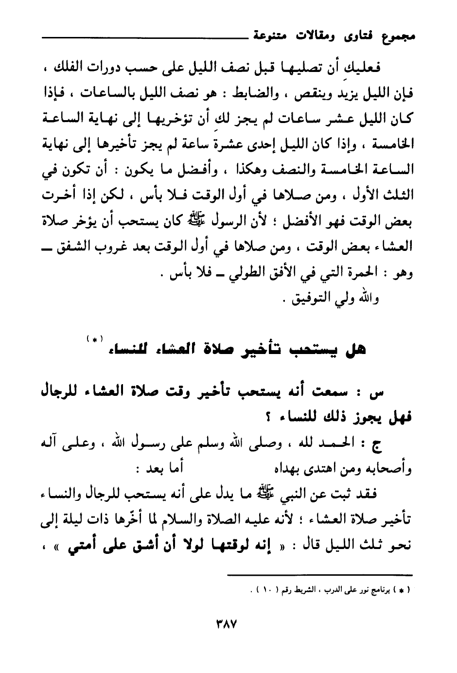 س: سمعت أنه يستحب تأخير وقت صلاة العشاء للرجال فهل يجوز ذلك للنساء؟