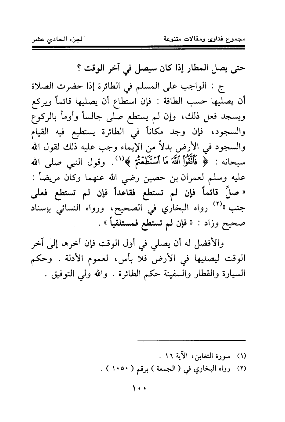 ج: الواجب على المسلم في الطائرة إذا حضرت الصلاة أن يصليها حسب الطاقة: فإن استطاع أن يصليها قائما ويركع ويسجد فعل ذلك، وإن لم يستطع صلى جالسا وأومأ بالركوع والسجود، فإن وجد مكانا في الطائرة يستطيع فيه القيام والسجود في الأرض بدلا من الإيماء وجب عليه ذلك لقول الله سبحانه: {فَاتَّقُوا اللَّهَ مَا اسْتَطَعْتُمْ} (¬1) وقول النبي صلى الله عليه وسلم لعمران بن حصين رضي الله عنهما وكان مريضا: «صل قائما فإن لم تستطع فقاعدا فإن لم تستطع صل قائما فإن لم تستطع فقاعدا فإن لم تستطع فعلى جنب (¬2) » رواه البخاري في الصحيح، ورواه النسائي بإسناد صحيح وزاد: «فإن لم تستطع فمستلقيا (¬3) » .