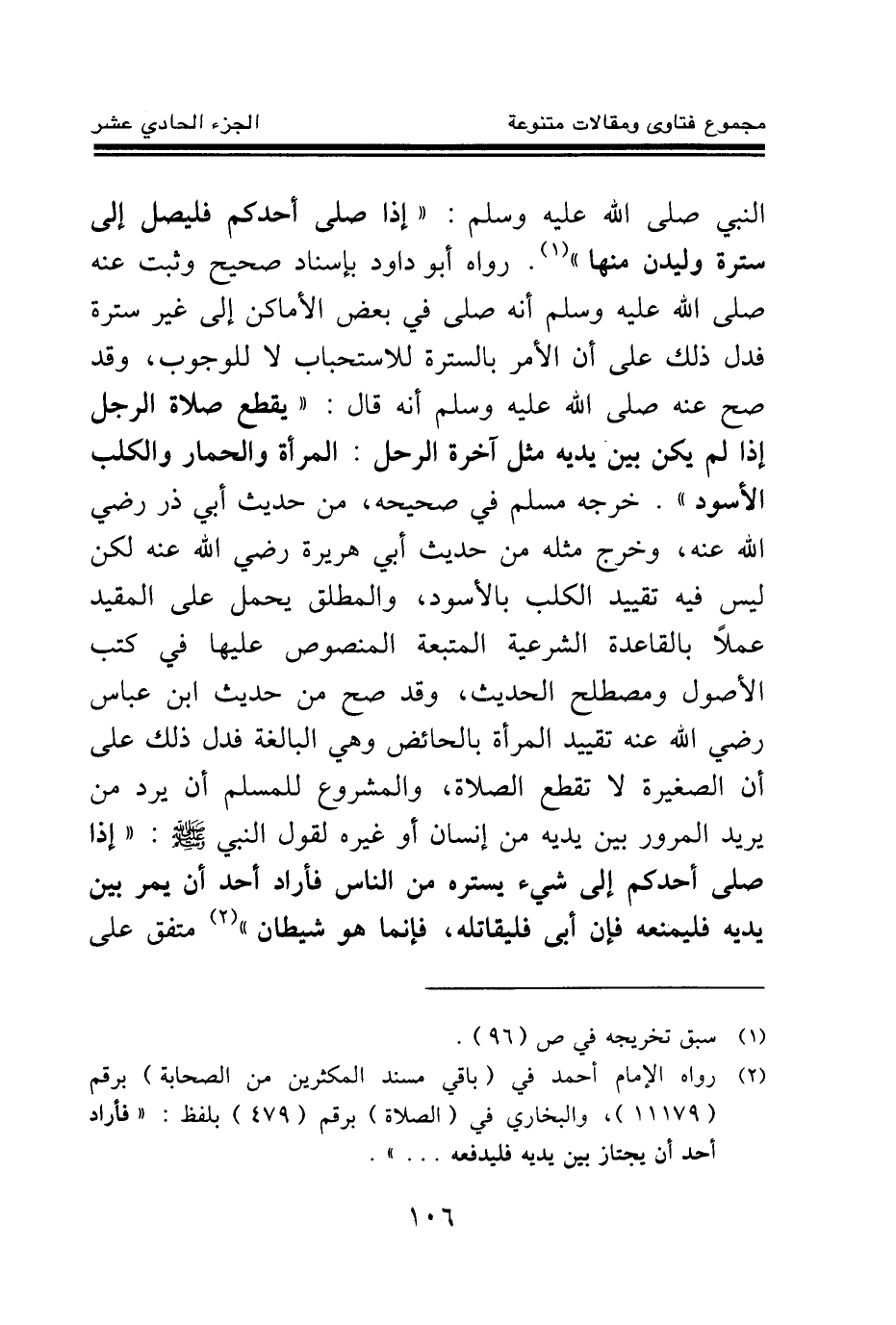 النبي صلى الله عليه وسلم: «إذا صلى أحدكم فليصل إلى سترة وليدن منها (¬1) » . رواه أبو داود بإسناد صحيح وثبت عنه صلى الله عليه وسلم أنه صلى في بعض الأماكن إلى غير سترة فدل ذلك على أن الأمر بالسترة للاستحباب لا للوجوب، وقد صح عنه صلى الله عليه وسلم أنه قال: «يقطع صلاة الرجل إذا لم يكن بين يديه مثل آخرة الرحل المرأة والحمار والكلب الأسود (¬2) » خرجه مسلم في صحيحه، من حديث أبي ذر رضي الله عنه، وخرج مثله من حديث أبي هريرة رضي الله عنه لكن ليس فيه تقييد الكلب بالأسود، والمطلق يحمل على المقيد عملا بالقاعدة الشرعية المتبعة المنصوص عليها في كتب الأصول ومصطلح الحديث، وقد صح من حديث ابن عباس رضي الله عنه تقييد المرأة بالحائض وهي البالغة فدل ذلك على أن الصغيرة لا تقطع الصلاة، والمشروع للمسلم أن يرد من يريد المرور بين يديه من إنسان أو غيره لقول النبي صلى الله عليه وسلم: «إذا صلى أحدكم إلى شيء يستره من الناس فأراد أحد أن يمر بين يديه فليمنعه فإن أبى فليقاتله فإنما هو شيطان (¬3) » متفق على
