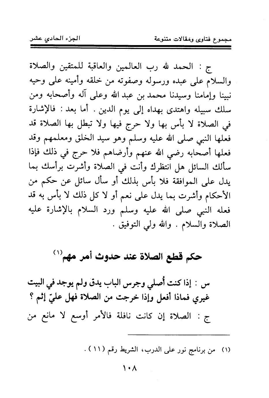 حكم قطع الصلاة عند حدوث أمر مهم (¬1) .