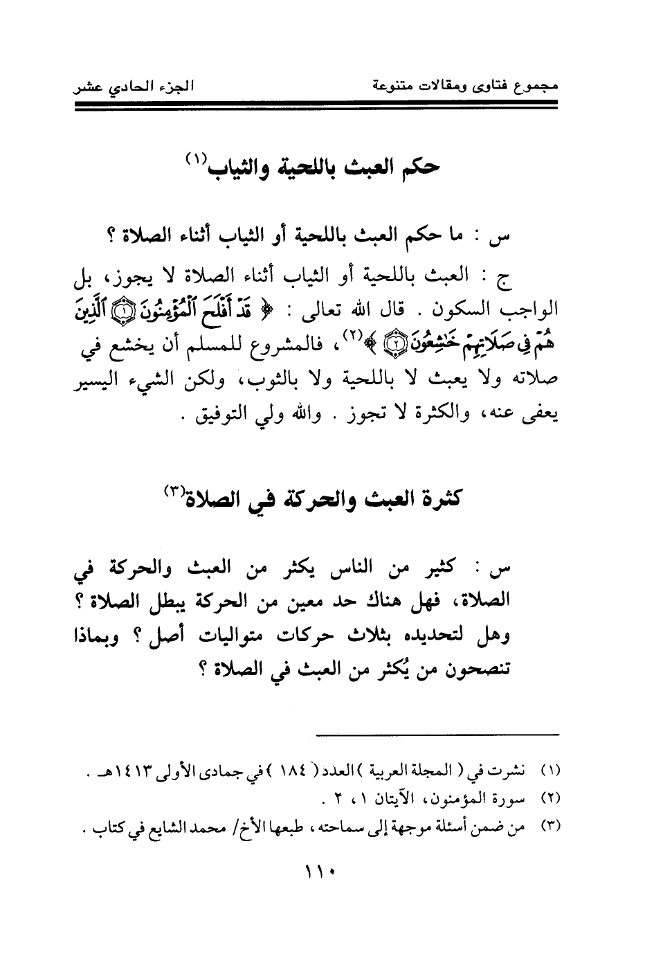ج: العبث باللحية أو الثياب أثناء الصلاة لا يجوز، بل الواجب السكون. قال الله تعالى: {قَدْ أَفْلَحَ الْمُؤْمِنُونَ} (¬1) {الَّذِينَ هُمْ فِي صَلَاتِهِمْ خَاشِعُونَ} (¬2) فالمشروع للمسلم أن يخشع في صلاته ولا يعبث لا باللحية ولا بالثوب، ولكن الشيء اليسير يعفى عنه، والكثرة لا تجوز. والله ولي التوفيق.