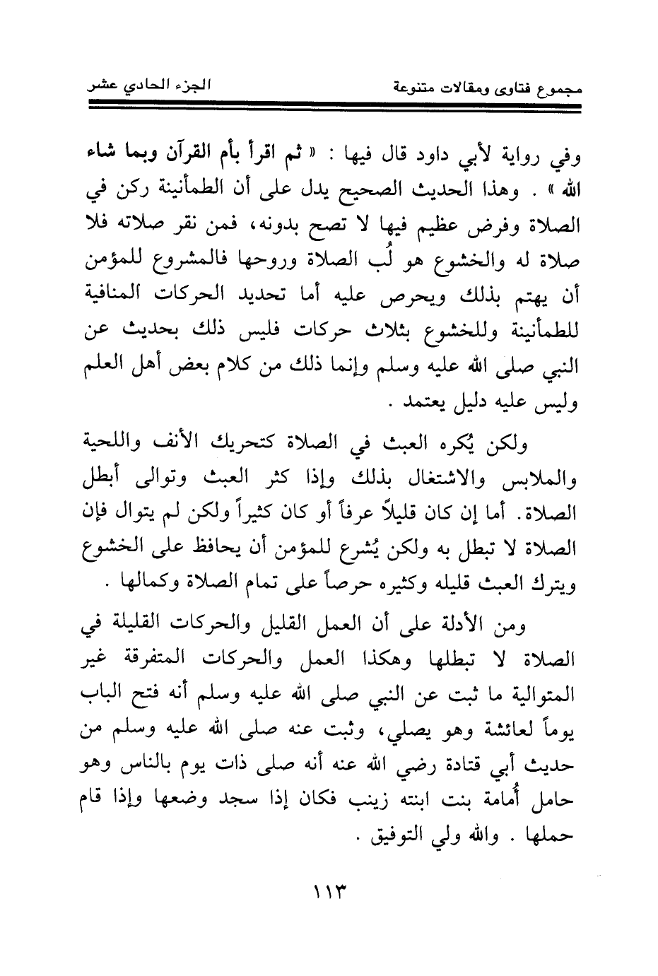 ومن الأدلة على أن العمل القليل والحركات القليلة في الصلاة لا تبطلها وهكذا العمل والحركات المتفرقة غير المتوالية ما ثبت عن النبي صلى الله عليه وسلم أنه فتح الباب يوما لعائشة وهو يصلي، وثبت عنه صلى الله عليه وسلم من حديث أبي قتادة رضي الله عنه «أنه صلى ذات يوم بالناس وهو حامل أمامة بنت ابنته زينب فكان إذا سجد وضعها وإذا قام حملها (¬2) » . والله ولي التوفيق.