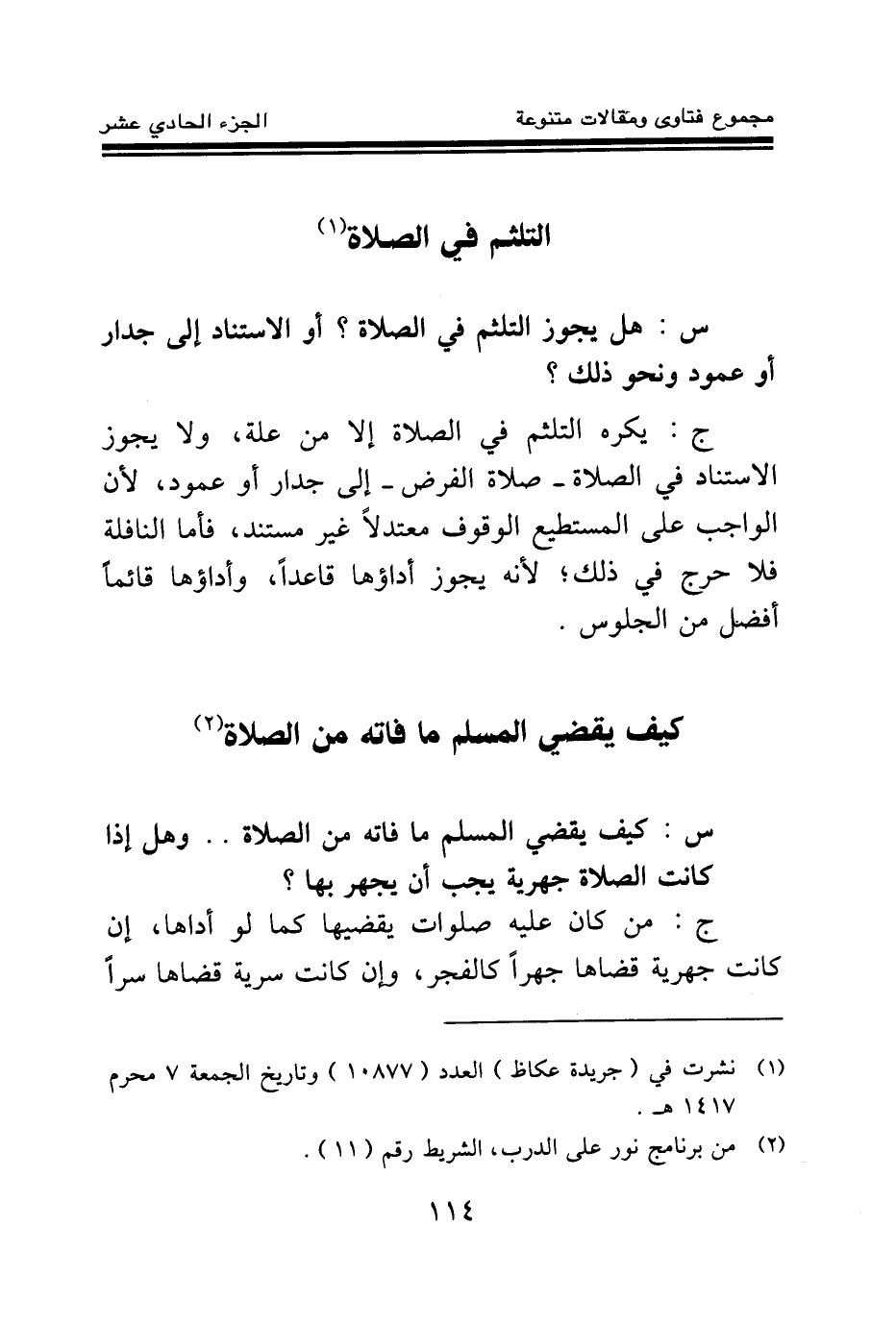 ج: يكره التلثم في الصلاة إلا من علة، ولا يجوز الاستناد في الصلاة - صلاة الفرض - إلى جدار أو عمود؛ لأن الواجب على المستطيع الوقوف معتدلا غير مستند، فأما النافلة فلا حرج في ذلك لأنه يجوز أداؤها قاعدا، وأداؤها قائما أفضل من الجلوس.