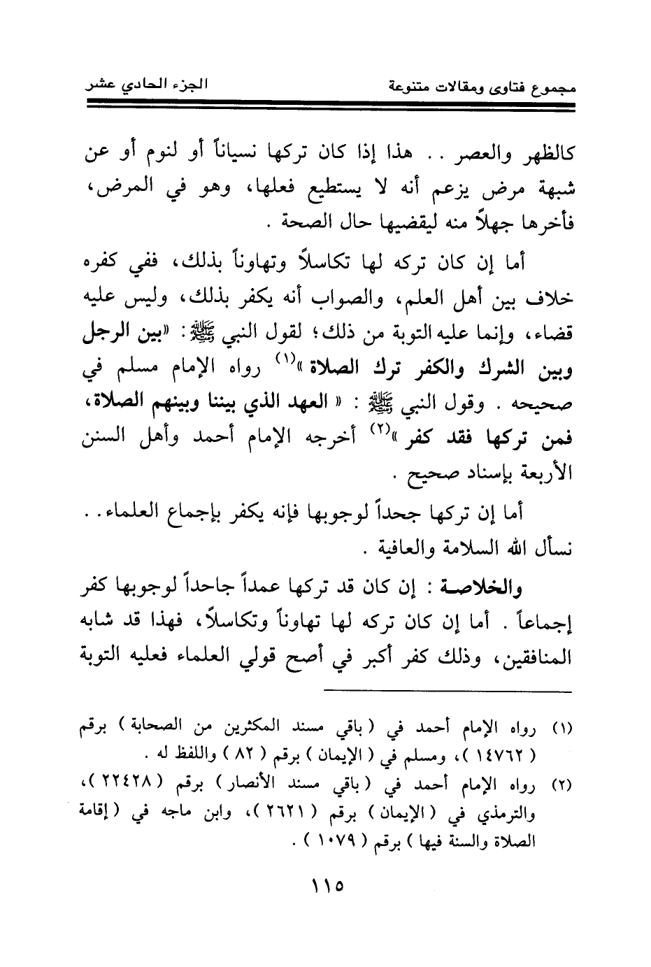 والخلاصة: إن كان قد تركها عمدا جاحدا لوجوبها كفر إجماعا. أما إن كان تركه لها تهاونا وتكاسلا، فهذا قد شابه المنافقين، وذلك كفر أكبر في أصح قولي العلماء فعليه التوبة