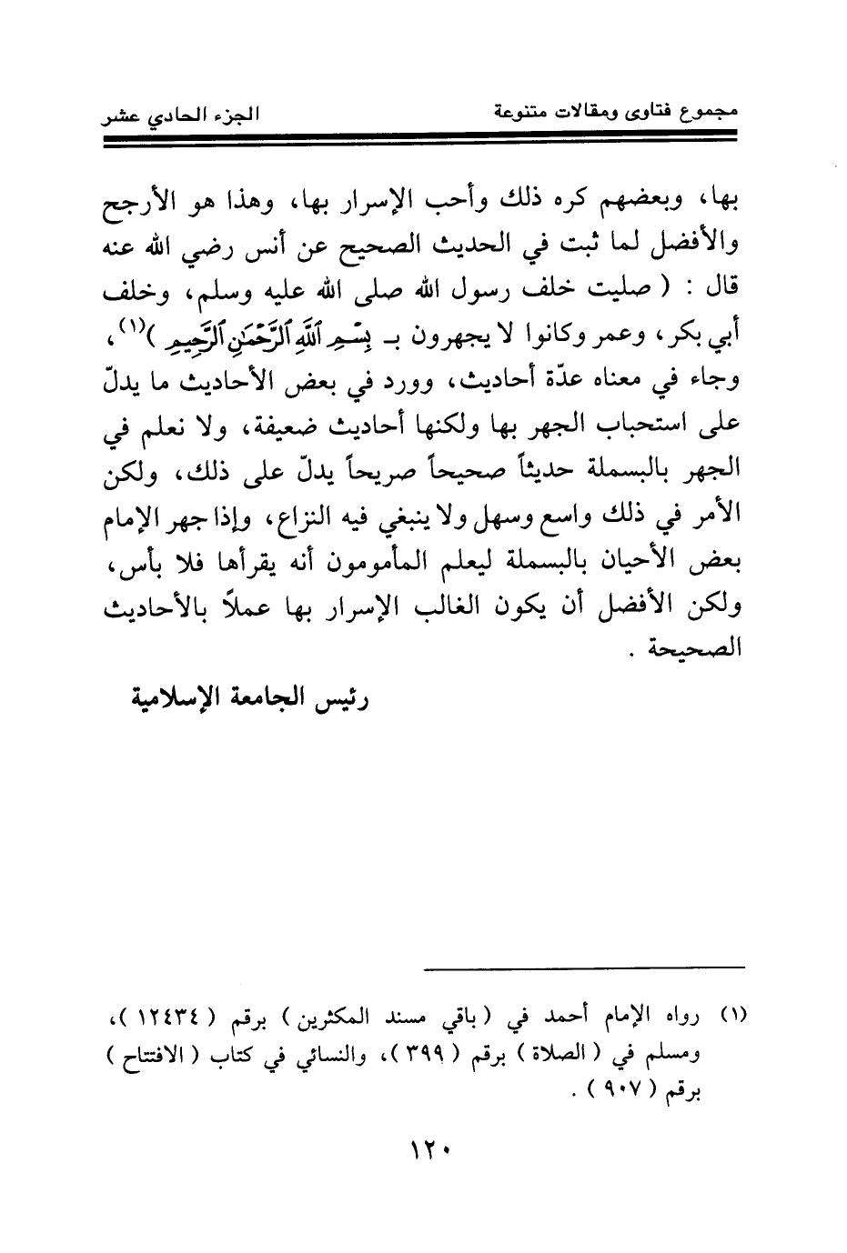 بها، وبعضهم كره ذلك وأحب الإسرار بها، وهذا هو الأرجح والأفضل لما ثبت في الحديث الصحيح عن أنس رضي الله عنه قال: «صليت خلف رسول الله صلى الله عليه وسلم وخلف أبي بكر وعمر وكانوا لا يجهرون بـ بسم الله الرحمن الرحيم (¬1) » ، وجاء في معناه عدة أحاديث، وورد في بعض الأحاديث ما يدل على استحباب الجهر بها ولكنها أحاديث ضعيفة، ولا نعلم في الجهر بالبسملة حديثا صحيحا صريحا يدل على ذلك، ولكن الأمر في ذلك واسع وسهل ولا ينبغي فيه النزاع وإذا جهر الإمام بعض الأحيان بالبسملة ليعلم المأمومون أنه يقرأها فلا بأس، ولكن الأفضل أن يكون الغالب الإسرار بها عملا بالأحاديث الصحيحة.