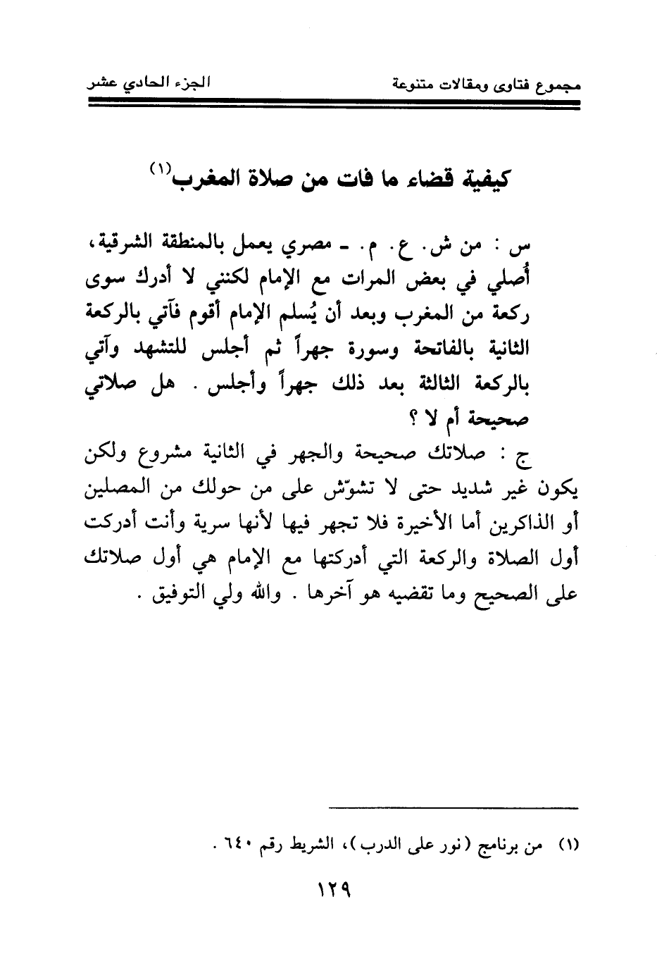 س: من ش. ع. م. - مصري يعمل بالمنطقة الشرقية، أصلي في بعض المرات مع الإمام لكنني لا أدرك سوى ركعة من المغرب وبعد أن يسلم الإمام أقوم فآتي بالركعة الثانية بالفاتحة وسورة جهرا ثم أجلس للتشهد وآتي بالركعة الثالثة بعد ذلك جهرا وأجلس. هل صلاتي صحيحة أم لا؟ .