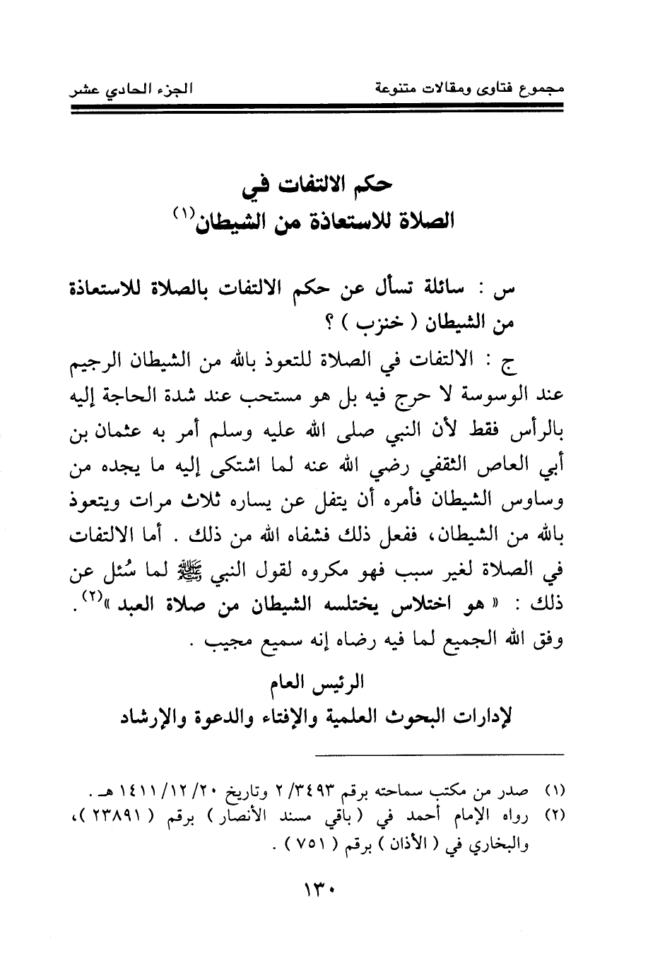ج: الالتفات في الصلاة للتعوذ بالله من الشيطان الرجيم عند الوسوسة لا حرج فيه بل هو مستحب عند شدة الحاجة إليه بالرأس فقط؛ لأن النبي صلى الله عليه وسلم أمر به عثمان بن أبي العاص الثقفي رضي الله عنه لما اشتكى إليه ما يجده من وساوس الشيطان فأمره أن يتفل عن يساره ثلاث مرات ويتعوذ بالله من الشيطان، ففعل ذلك فشفاه الله من ذلك. أما الالتفات في الصلاة لغير سبب فهو مكروه لقول النبي صلى الله عليه وسلم لما سئل عن ذلك: «هو اختلاس يختلسه الشيطان من صلاة العبد (¬1) » . وفق الله الجميع لما فيه رضاه إنه سميع مجيب.