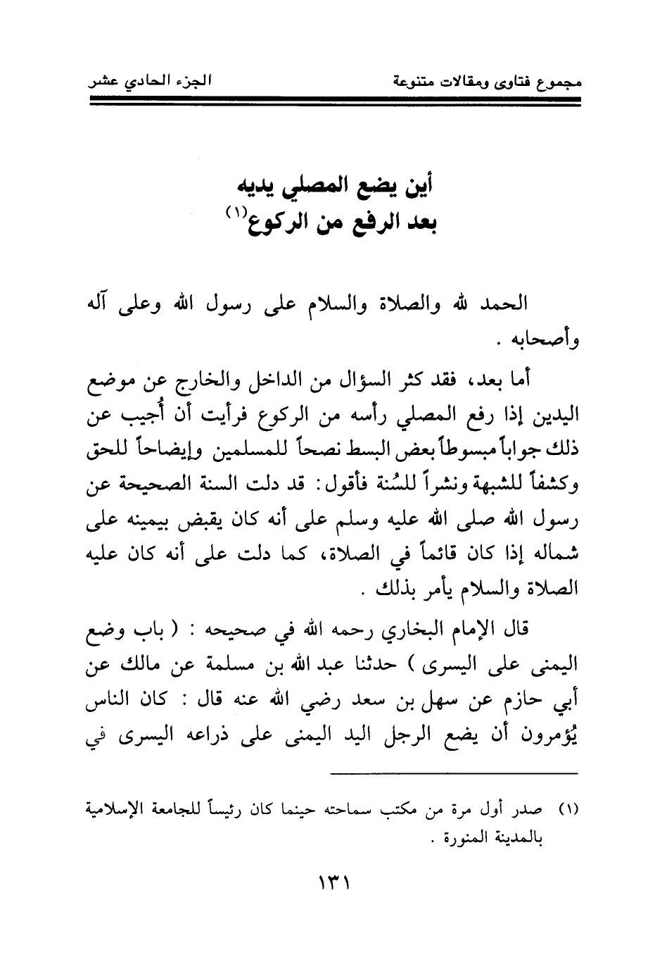 الحمد لله والصلاة والسلام على رسول الله وعلى آله وأصحابه. أما بعد، فقد كثر السؤال من الداخل والخارج عن موضع اليدين إذا رفع المصلي رأسه من الركوع فرأيت أن أجيب عن ذلك جوابا مبسوطا بعض البسط نصحا للمسلمين وإيضاحا للحق وكشفا للشبهة ونشرا للسنة فأقول: قد دلت السنة الصحيحة عن رسول الله صلى الله عليه وسلم على أنه كان يقبض بيمينه على شماله إذا كان قائما في الصلاة، كما دلت على أنه كان عليه الصلاة والسلام يأمر بذلك.