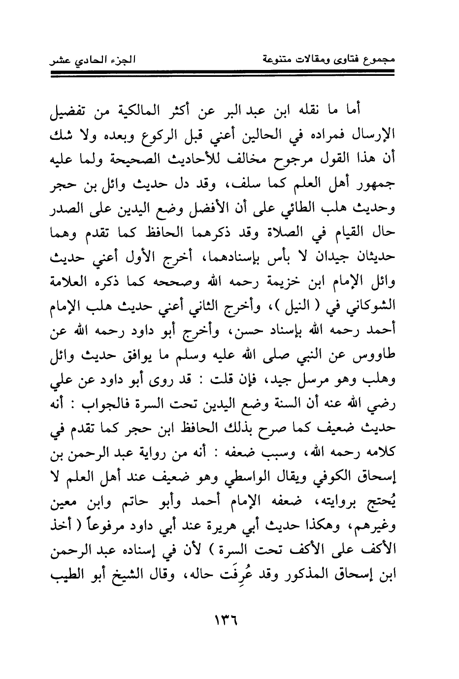 أما ما نقله ابن عبد البر عن أكثر المالكية من تفضيل الإرسال فمراده في الحالين أعني قبل الركوع وبعده ولا شك أن هذا القول مرجوح مخالف للأحاديث الصحيحة ولما عليه جمهور أهل العلم كما سلف، وقد دل حديث وائل بن حجر وحديث هلب الطائي على أن الأفضل وضع اليدين على الصدر حال القيام في الصلاة وقد ذكرهما الحافظ كما تقدم وهما حديثان جيدان لا بأس بإسنادهما، أخرج الأول أعني حديث وائل الإمام ابن خزيمة رحمه الله وصححه كما ذكره العلامة الشوكاني في (النيل) ، وأخرج الثاني أعني حديث هلب الإمام أحمد رحمه الله بإسناد حسن، وأخرج أبو داود رحمه الله عن طاوس عن النبي صلى الله عليه وسلم ما يوافق حديث وائل وهلب وهو مرسل جيد، فإن قلت: قد روى أبو داود عن علي رضي الله عنه «أن السنة وضع اليدين تحت السرة (¬1) » فالجواب: أنه حديث ضعيف كما صرح بذلك الحافظ ابن حجر كما تقدم في كلامه رحمه الله، وسبب ضعفه: أنه من رواية عبد الرحمن بن إسحاق الكوفي، ويقال الواسطي وهو ضعيف عند أهل العلم لا يحتج بروايته، ضعفه الإمام أحمد وأبو حاتم وابن معين وغيرهم، وهكذا حديث أبي هريرة عند أبي داود مرفوعا «أخذ الأكف على الأكف تحت السرة (¬2) » لأن في إسناده عبد الرحمن بن إسحاق المذكور وقد عرفت حاله.