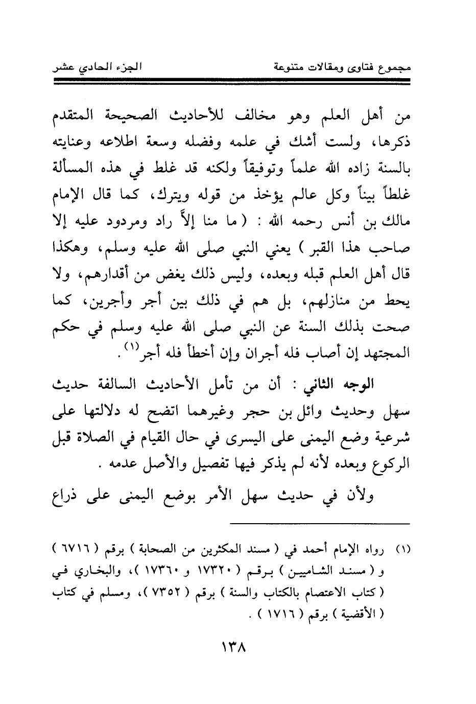الوجه الثاني: أن من تأمل الأحاديث السالفة حديث سهل وحديث وائل بن حجر وغيرهما اتضح له دلالتها على شرعية وضع اليمنى على اليسرى في حال القيام في الصلاة قبل الركوع وبعده لأنه لم يذكر فيها تفصيل والأصل عدمه.