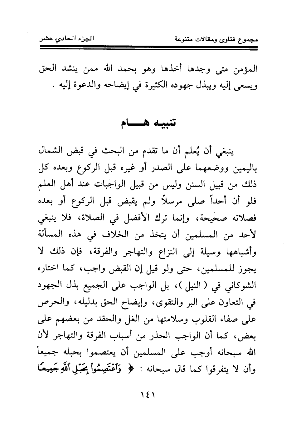 ينبغي أن يعلم أن ما تقدم من البحث في قبض الشمال باليمين ووضعهما على الصدر أو غيره قبل الركوع وبعده كل ذلك من قبيل السنن وليس من قبيل الواجبات عند أهل العلم، فلو أن أحدا صلى مرسلا ولم يقبض قبل الركوع أو بعده فصلاته صحيحة، وإنما ترك الأفضل في الصلاة، فلا ينبغي لأحد من المسلمين أن يتخذ من الخلاف في هذه المسألة وأشباهها وسيلة إلى النزاع والتهاجر والفرقة، فإن ذلك لا يجوز للمسلمين، حتى ولو قيل إن القبض واجب، كما اختاره الشوكاني في (النيل) ، بل الواجب على الجميع بذل الجهود في التعاون على البر والتقوى، وإيضاح الحق بدليله، والحرص على صفاء القلوب وسلامتها من الغل والحقد من بعضهم على بعض، كما أن الواجب الحذر من أسباب الفرقة التهاجر لأن الله سبحانه أوجب على المسلمين أن يعتصموا بحبله جميعا وأن لا يتفرقوا كما قال سبحانه: {وَاعْتَصِمُوا بِحَبْلِ اللَّهِ جَمِيعًا وَلَا تَفَرَّقُوا} (¬1)