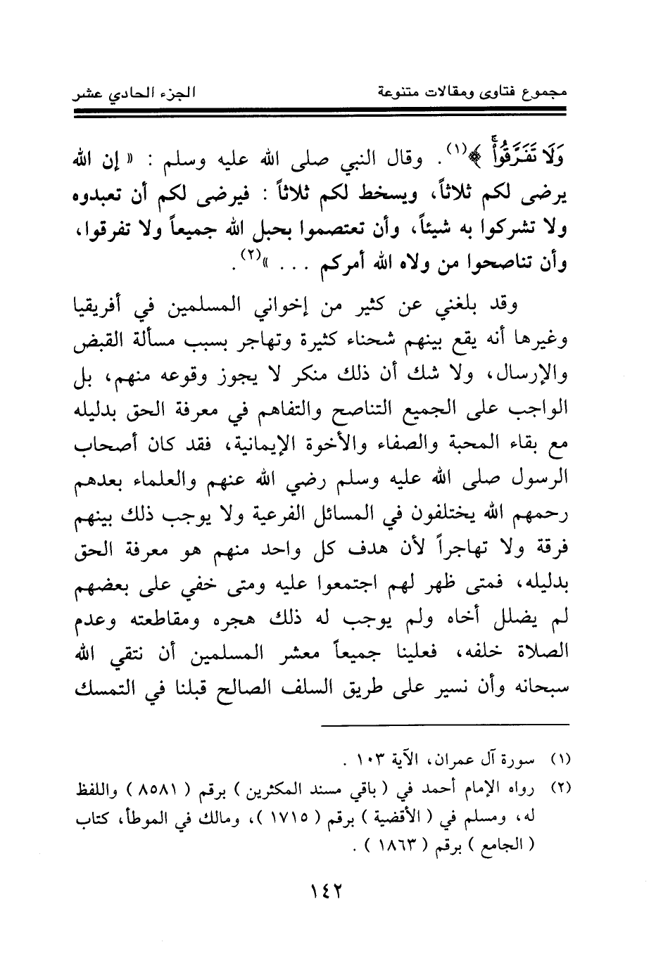 وقد بلغني عن كثير من إخواني المسلمين في أفريقيا وغيرها أنه يقع بينهم شحناء كثيرة وتهاجر بسبب مسألة القبض والإرسال، ولا شك أن ذلك منكر لا يجوز وقوعه منهم، بل الواجب على الجميع التناصح والتفاهم في معرفة الحق بدليله مع بقاء المحبة والصفاء والأخوة الإيمانية، فقد كان أصحاب الرسول صلى الله عليه وسلم رضي الله عنهم والعلماء بعدهم رحمهم الله يختلفون في المسائل الفرعية ولا يوجب ذلك بينهم فرقة ولا تهاجرا لأن هدف كل واحد منهم هو معرفة الحق بدليله، فمتى ظهر لهم اجتمعوا عليه ومتى خفي على بعضهم لم يضلل أخاه ولم يوجب له ذلك هجره ومقاطعته وعدم الصلاة خلفه، فعلينا جميعا معشر المسلمين أن نتقي الله سبحانه وأن نسير على طريق السلف الصالح قبلنا في التمسك