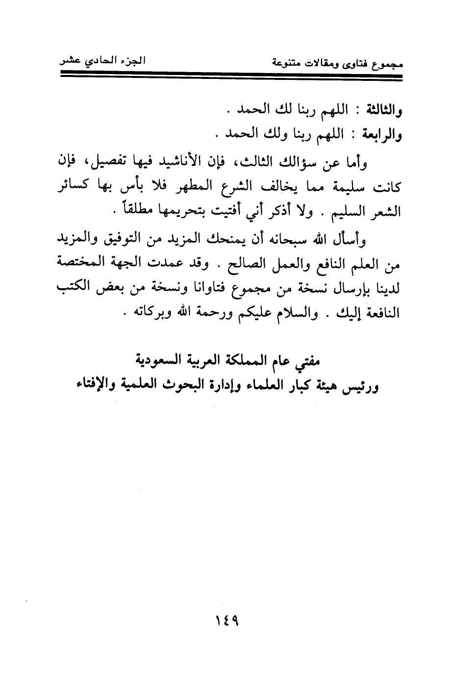 وأما عن سؤالك الثالث، فإن الأناشيد فيها تفصيل، فإن كانت سليمة مما يخالف الشرع المطهر فلا بأس بها كسائر الشعر السليم. ولا أذكر أني أفتيت بتحريمها مطلقا.