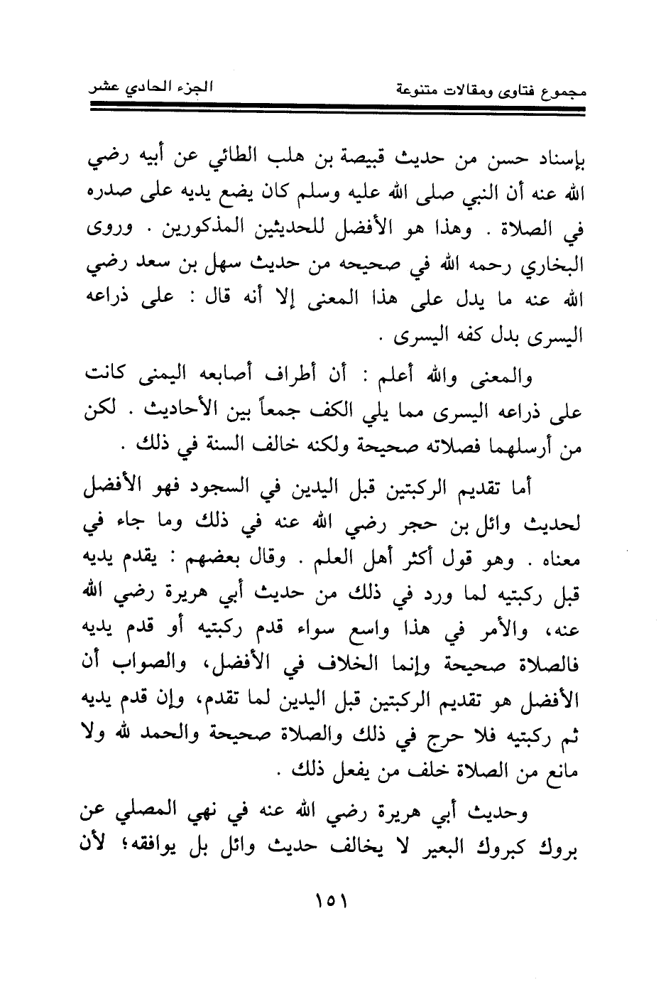 بإسناد حسن من حديث قبيصة بن هلب الطائي عن أبيه رضي الله عنه «أن النبي صلى الله عليه وسلم كان يضع يديه على صدره في الصلاة» . وهذا هو الأفضل للحديثين المذكورين. وروى البخاري رحمه الله في صحيحه من حديث سهل بن سعد رضي الله عنه ما يدل على هذا المعنى إلا أنه قال: على ذراعه اليسرى بدل كفه اليسرى.